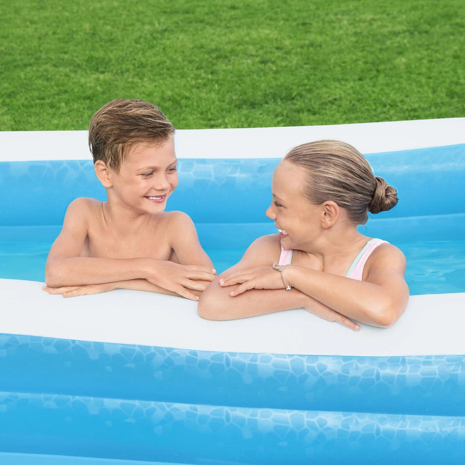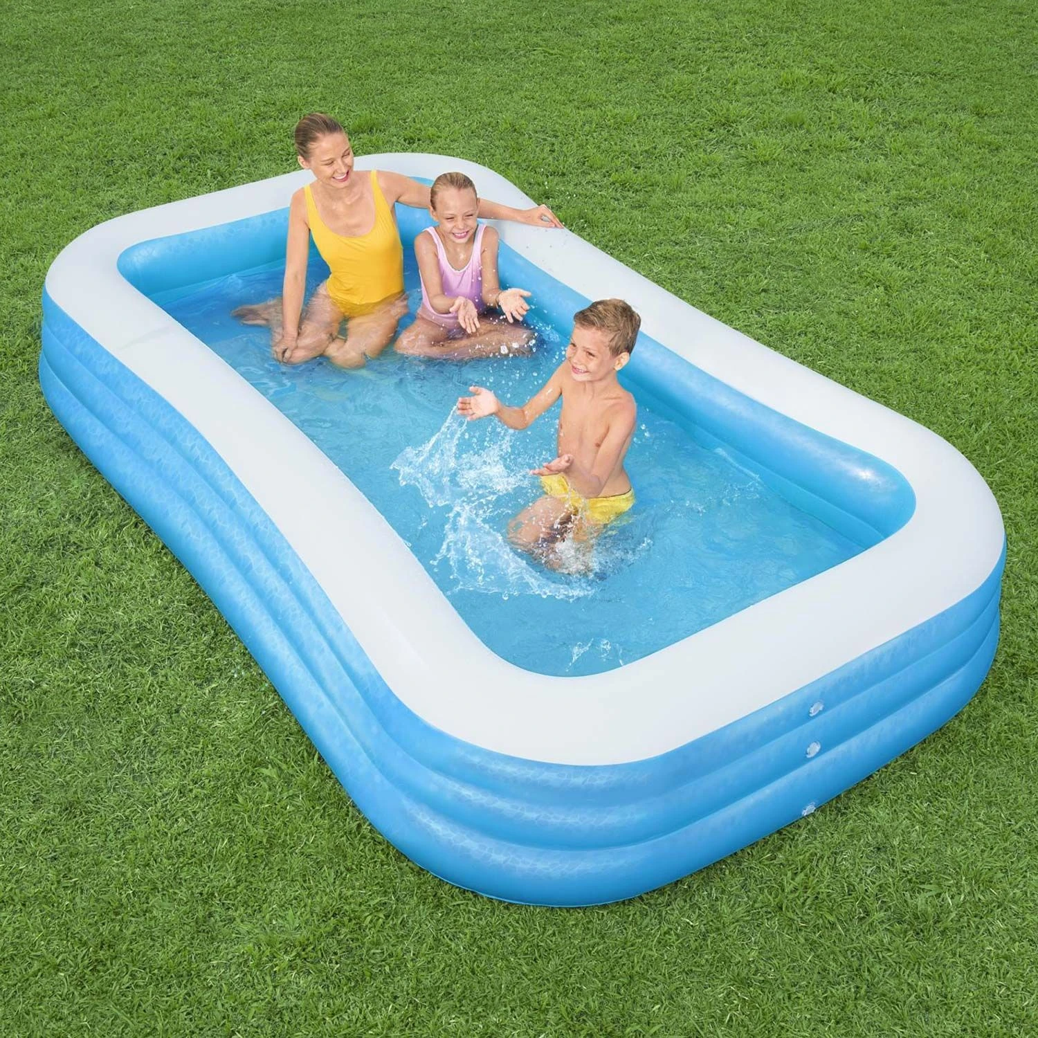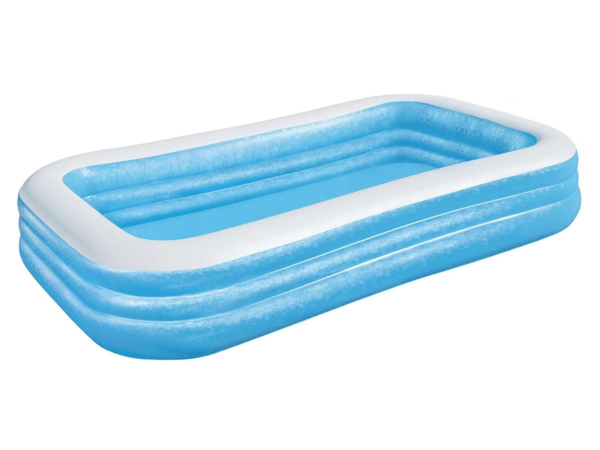 Dit Bestway De Luxe 3-rings opblaasbare familie zwembad is 305 cm lang, 183 cm breed, 56 cm hoog en heeft een watercapaciteit van 1161 liter. De 3 ringen van het zwembad zijn eenvoudig op te pompen (pomp niet inbegrepen). Het ruime Bestway De Luxe opblaasbare zwembad biedt uren waterpret voor de hele familie. Met het handige aftapventiel laat je het zwembad snel weer leeglopen. Specificaties:-Rechthoekig familie zwembad De Luxe-Lengte: 305 cm-Breedte: 183 cm -Hoogte: 56 cm-Watercapaciteit: 1161 liter-Aanbevolen leeftijd: vanaf 6 jaar-Drie gelijke ringen-Drie driewegventielen-Stabiele I-beam constructie-Extra brede wanden