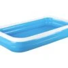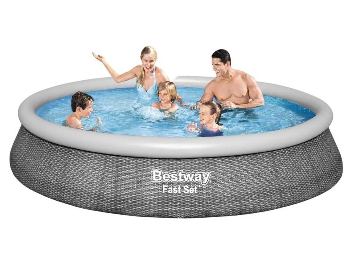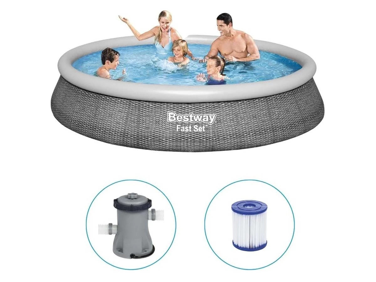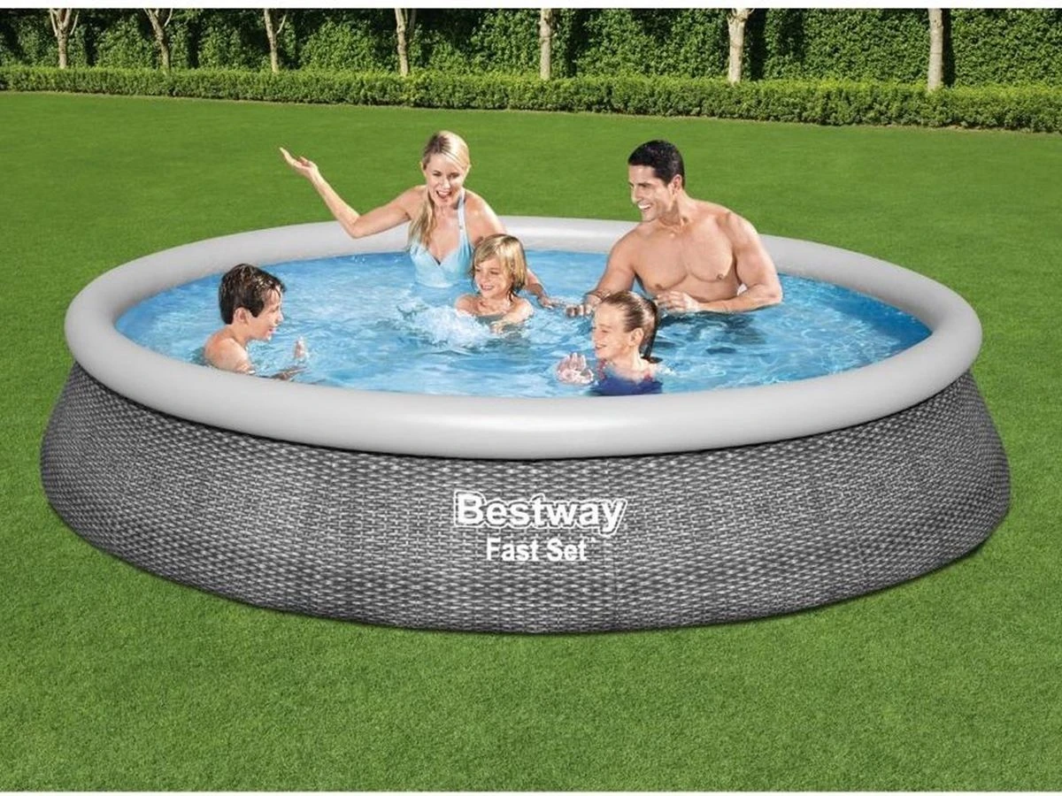 De buitenkant van dit bad is voorzien van een Rotan motief. De middelste laag bestaat uit gerasterd polyester en de buitenste 2 lagen zijn gemaakt van PVC. Samen met de opblaasrand zorgt dit ervoor dat het zwembad extra stabiel is. Het zwembad is voorzien van pomp aansluitingen en een pomp is inbegrepen in het pakket.