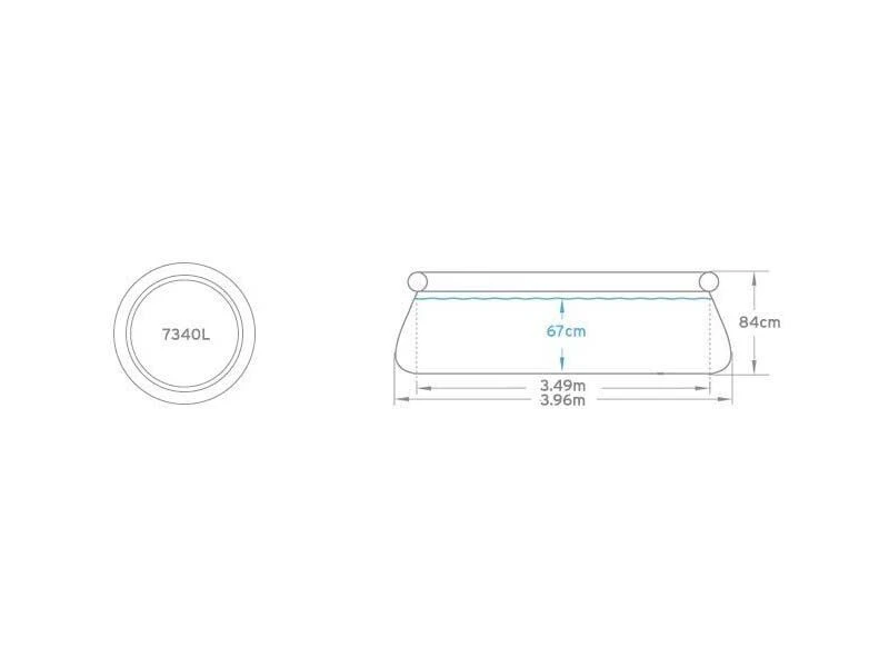 De totale inhoud bedraag 7340liter en er wordt een bestway 2006 filterpomp met 32mm aansluitingen en filtercartridge type II meegeleverd