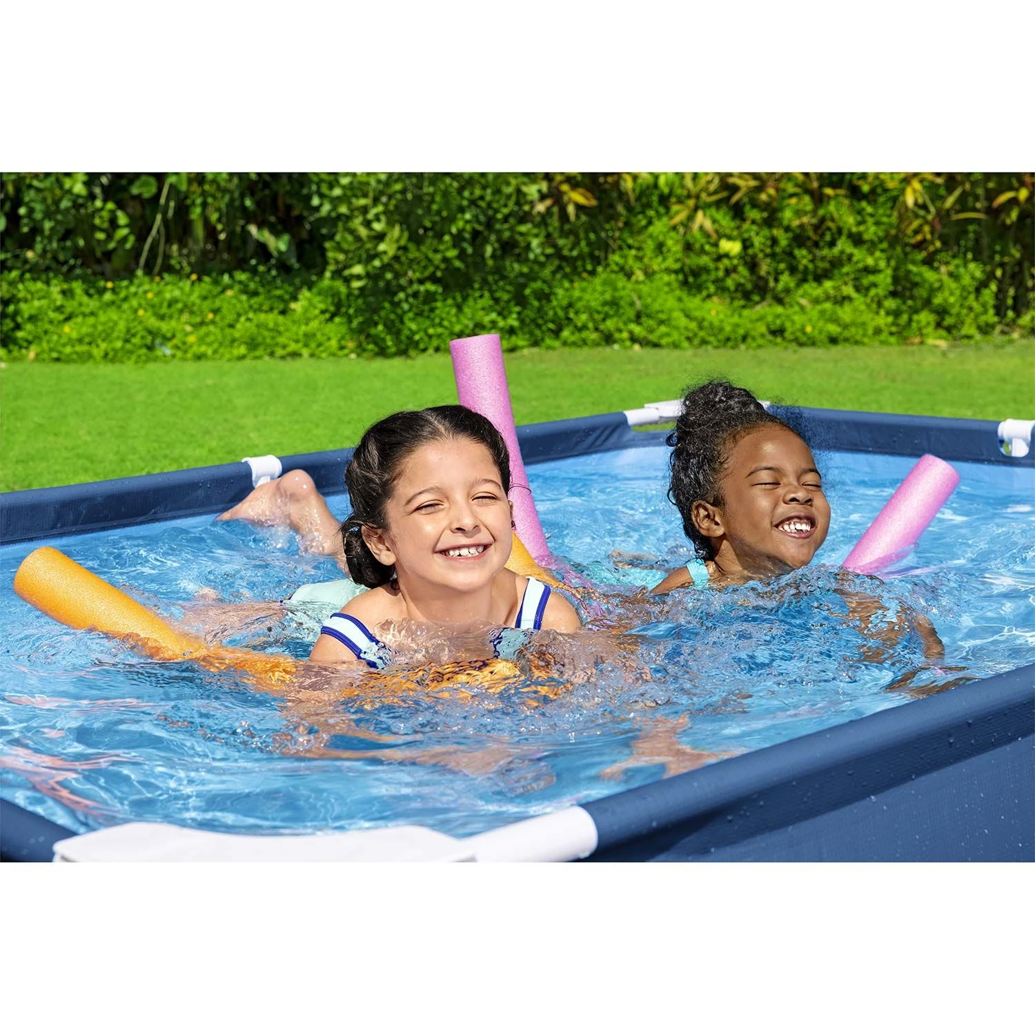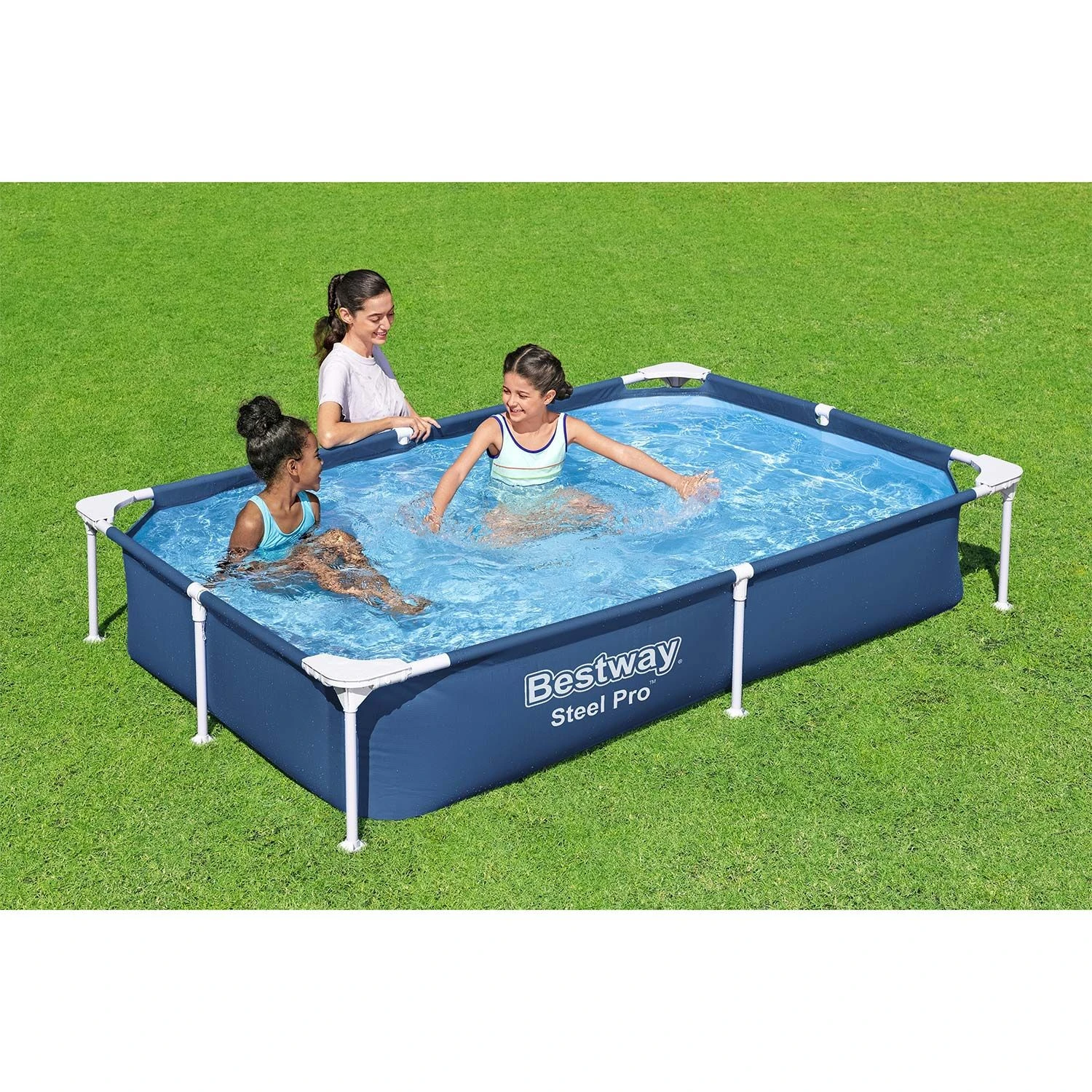 Dit rechthoekige Bestway frame zwembad is 221 cm lang, 150 cm breed en 43 cm hoog. Dit Bestway Steel Pro bovengrondse zwembad heeft een roestbestendig stalen frame en wanden gemaakt van sterk UV en chloorbestendig Tritech materiaal. Het zwembad is snel en zonder gereedschap te monteren. Aan het eind van het seizoen is het zwembad net zo snel weer opgeborgen. Het aftapventiel kan verbonden worden met een tuinslang zodat je het water op de gewenste plek weg kan laten lopen. Het Bestway Steel Pro rechthoekige frame zwembad wordt geleverd zonder trap en filterpomp. Laat kinderen nooit zonder toezicht van een volwassene in het zwembad spellen.