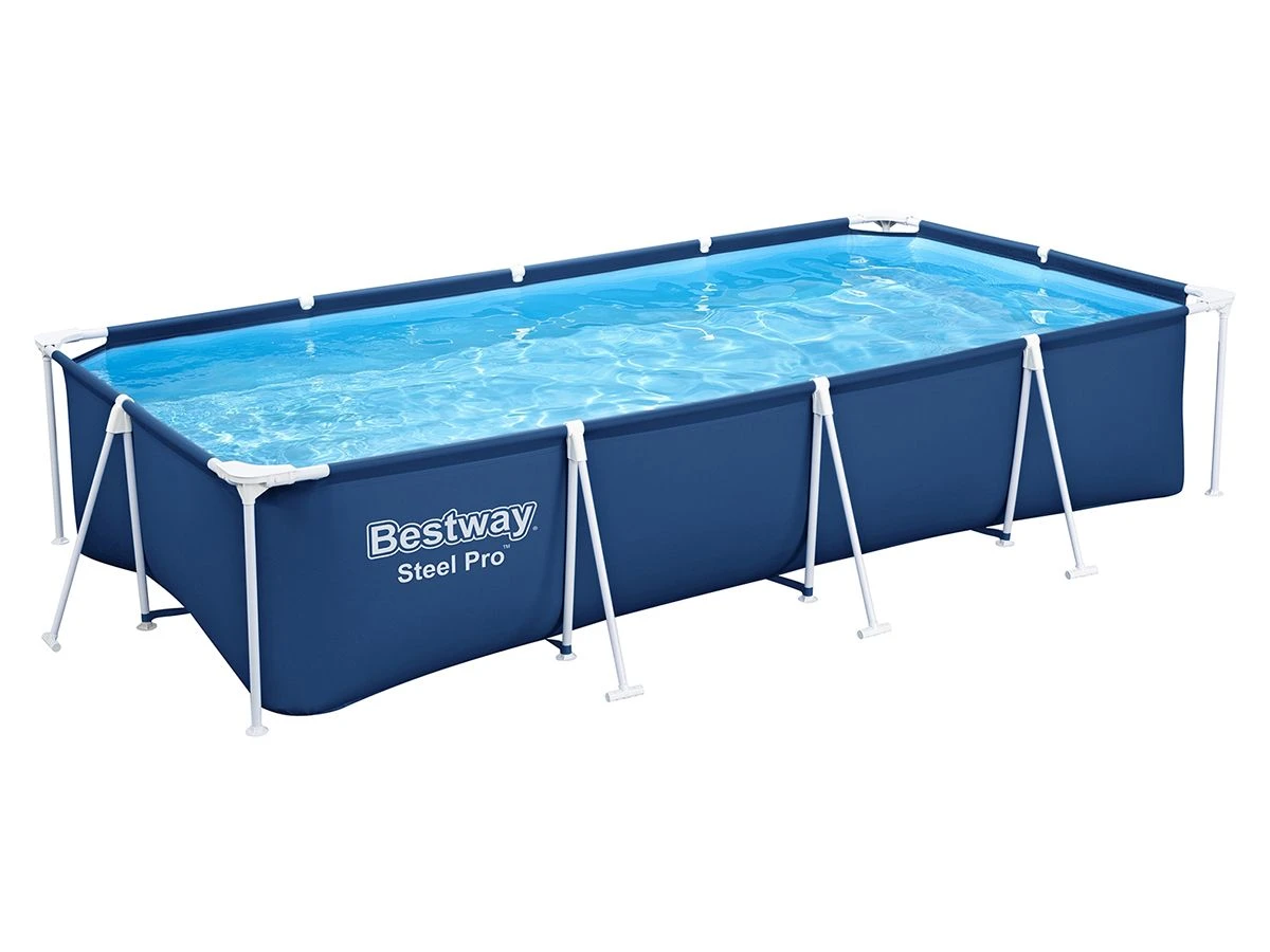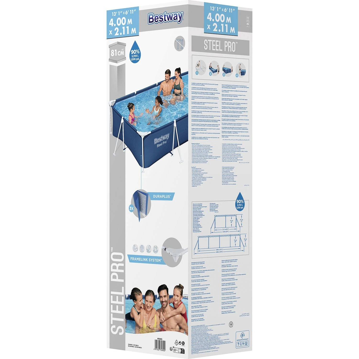 Het Bestway Steel Pro bovengrondse zwembad met een lengte van 400 cm, een breedte van 211 cm en een hoogte van 81 cm heeft een roestbestendig stalen frame en wanden gemaakt van sterk UV en chloorbestendig DuraPlus materiaal. De buitenmaat van het zwembad is 466 cm bij 276 cm en de waterinhoud van het Bestway Steel Pro frame zwembad is 5700 liter. Dit Bestway zwembad is snel en zonder gereedschap te monteren met het framelink systeem. Het sterke roestbestendige stalen frame wordt in elkaar geklikt met op maat gemaakte t-connectoren. Hierdoor ontstaat een sterke buisverbinding en wordt metaal op metaal corrosie voorkomen. Aan het eind van het seizoen is het zwembad net zo snel weer opgeborgen. Zeker met het handige aftapventiel dat verbonden kan worden met een tuinslang zodat je het water op de gewenste plek weg kan laten lopen. Het Bestway Steel Pro rechthoekige frame zwembad wordt geleverd zonder pomp en zonder trap. Het is wel mogelijk een pomp aan te sluiten op dit Steel Pro frame zwembad.