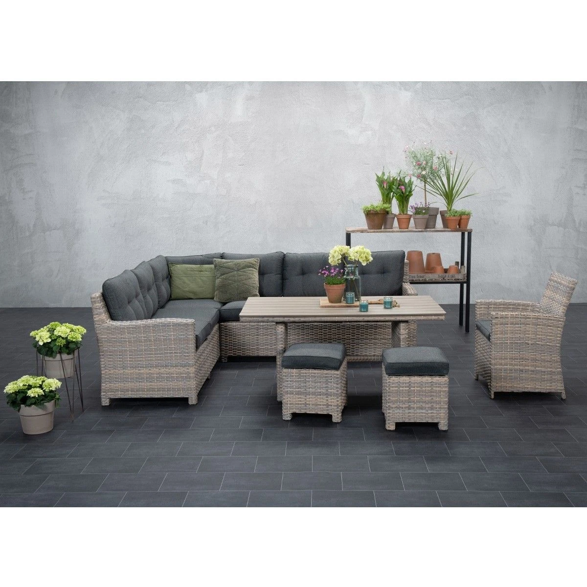 Twijfel je tussen een loungeset of een tuintafel met stoelen? Met de Alaska lounge dining set hoef je niet meer te kiezen tussen comfortabel dineren of heerlijk loungen. Deze mooie en ruime lounge dining set van kwaliteitsmerk Garden Impressions heeft het allebei! Deze lounge dining set is vervaardigd uit een onderhoudsvrij aluminium frame met daaromheen weerbestendig L-shape wicker draad, waardoor je het hele jaar kunt genieten van deze mooie lounge dining set. Het wicker is gemaakt van een stevige kunststof waardoor de set zeer duurzaam is. De Alaska loungeset wordt compleet geleverd met hoogwaardige kwaliteit polyester zit- en rugkussens. De rugkussens hebben een klassieke uitstraling door de aangebrachte steps. De zitkussens zijn voorzien van een rits, waardoor de hoesjes met de hand gewassen kunnen worden. De lounge kussens zijn niet waterbestendig en kunnen na gebruik worden opgeborgen in de schuur of in een kussenbox. Wel zijn de kussens voorzien van een waterafstotende coating. Dit is vooral erg praktisch als er bijvoorbeeld op het kussen wordt gemorst met drinken. Je veegt het vocht er namelijk gemakkelijk weer af. De ruime bijpassende lounge dining tafel is voorzien van een mooi polywood tafelblad. Polywood zijn “houtlook” latten, dit is een onderhoudsvriendelijke kunststof met een mooie houtstuctuur. De Alaska lounge dining set bestaat uit twee losse bankdelen, een hoge tafel en twee krukjes. De lounge bankdelen kunnen aan de onderzijde door middel van connectie clips eenvoudig aan elkaar vast worden gezet. Na ontvangst van de set moet alleen een armleuning en het onderstel van de tafel gemonteerd worden. Dit is gemakkelijk zelf te doen. De Alaska lounge dining set is leverbaar in twee kleurstellingen en in twee opstellingen (linker- en rechter uitvoering) te plaatsen. Daarnaast kan de Alaska lounge dining set worden uitgebreid met een dining fauteuil in dezelfde kleurstelling. De afmeting van de setopstelling is L 255 x B 205 x H 85 cm, de tafel is L 150 x B 80 x H 66 cm en de kurkjes zijn B 40 x D 40 x H 46 cm. Gemaakt van wicker in de kleur vintage willow met aluminium binnen frame en polyester antraciet kleurige kussens.