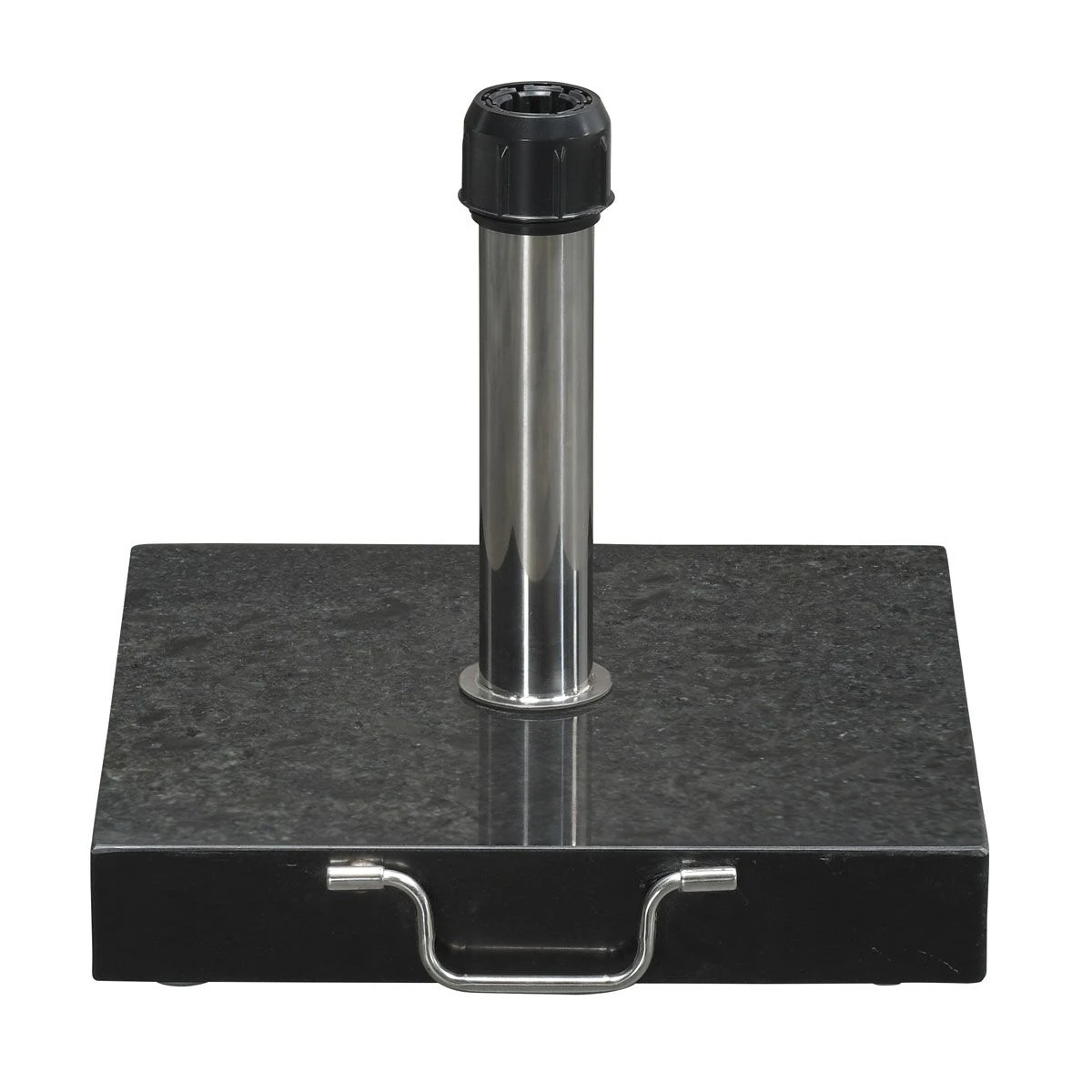 Heb je een mooie parasol gekocht en wil je hiervoor ook een mooie parasolvoet met een luxe uitstraling aanschaffen? Dan is de Cosmo granieten parasolvoet van kwaliteitsmerk Garden Impressions een uitstekende keuze. Deze parasolvoet is namelijk vervaardigd uit onderhoudsvrij graniet in de kleur antraciet. De parasolvoet is voorzien van een handig handvat waarmee de voet verplaatst kan worden. De Cosmo granieten parasolvoet is vervaardigd in antraciet kleurig graniet waarvan de bovenzijde is gepolijst, dit geeft de voet een strakke en luxe uitstraling. De parasolvoet is voorzien van twee nylon wielen met aan de tegenovergestelde zijde een mooi RVS handvat. Hierdoor is de voet gemakkelijk te verplaatsen naar elke plek in de tuin. De parasolbuis is gemaakt van RVS en is geschikt voor stokparasols met een maximale buisdikte van 55 millimeter. De parasol kan goed worden vastgezet door middel van de draaimechanisme rond te draaien. Het is belangrijk dat het juiste gewicht voor de parasol wordt gekozen. Denk er altijd goed bij na waar de parasol geplaatst gaat worden. Staat er doorgaans veel wind, dan is het beter om een zwaardere voet aan te schaffen. En de grootte en het gewicht van de parasol spelen uiteraard ook een rol. Weet je niet zeker welk gewicht je het beste kunt nemen, dan kun je het beste contact opnemen met een van onze verkoop adviseurs. Graniet is een natuurproduct wat zijn eigen unieke kenmerken heeft. Het kan voorkomen dat in de granieten parasolvoet een ader van de steen zichtbaar is. Dit doet geen afbreuk aan de kwaliteit van het product. Na ontvangst dient de Cosmo parasolvoet nog gemonteerd te worden. De pijp moet nog aan de voet worden gemonteerd worden. Dit is op een gemakkelijke wijze zelf te doen door de bijgeleverde handleiding en montage benodigdheden. De Cosmo parasolvoet is in drie gangbare formaten verkrijgbaar: 30 kg, 40 kg of 60 kg. Daarnaast is de parasolvoet verkrijgbaar in het antraciet, gemengd grijs of zwart.