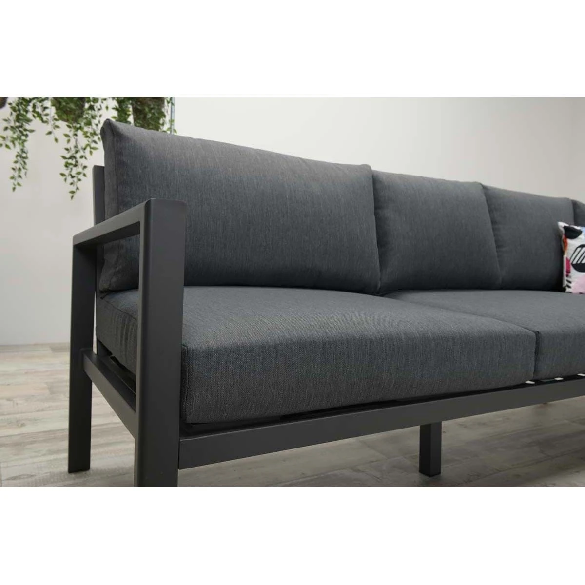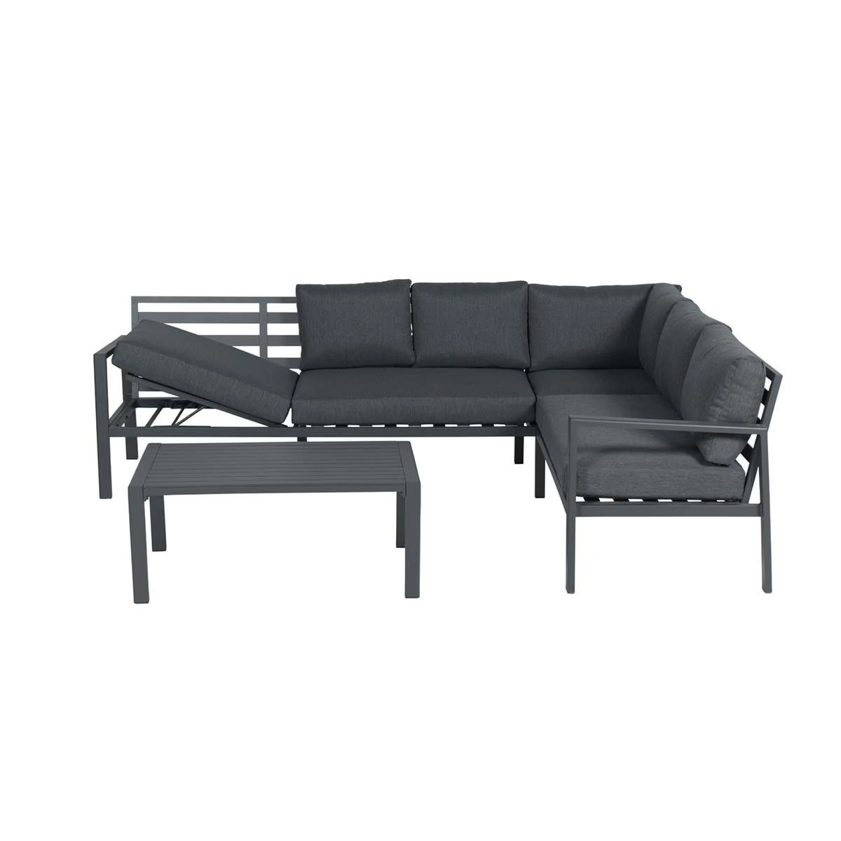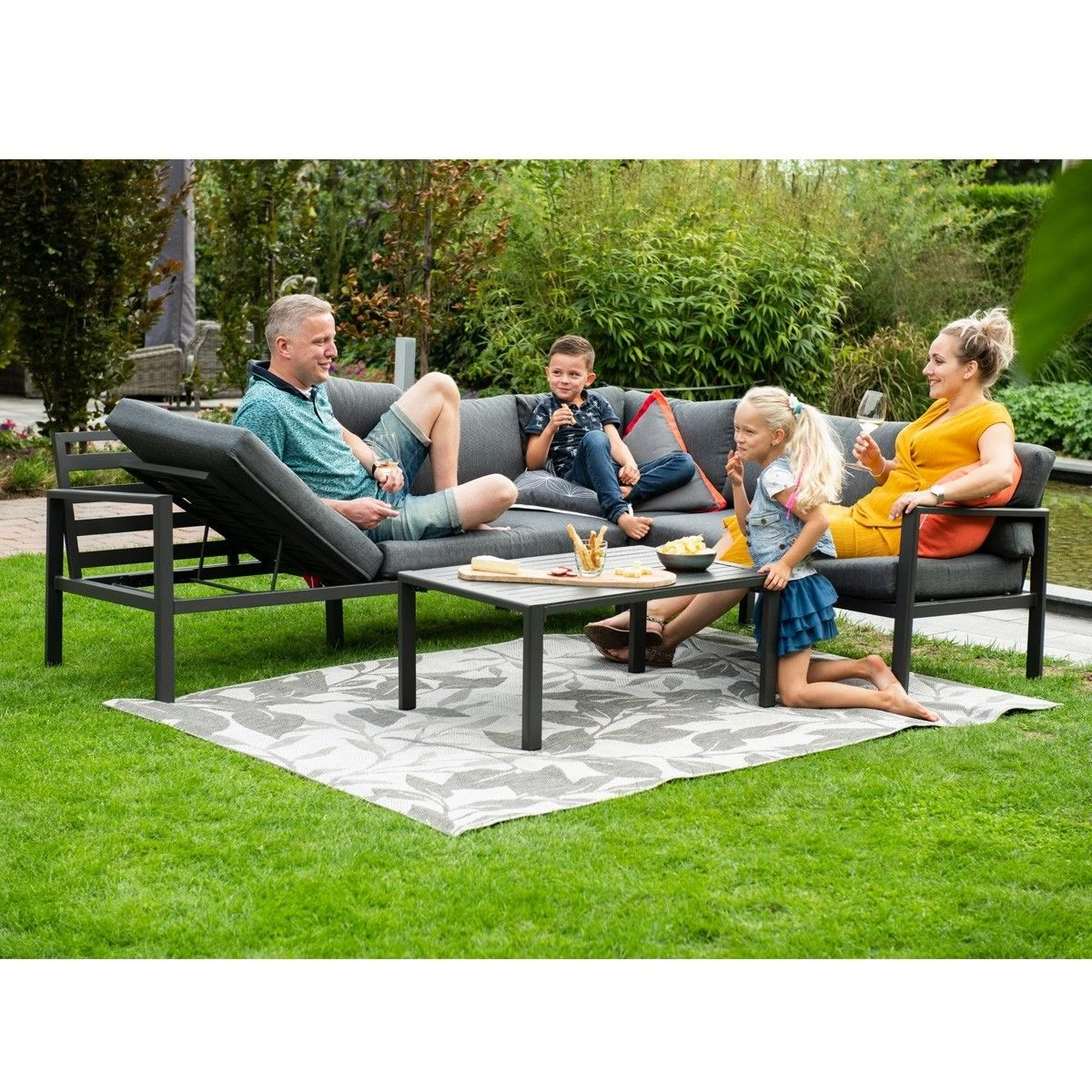 Op de Denver loungeset van het kwaliteitsmerk Garden Impressions kan het ontspannen pas echt beginnen. Deze mooie loungeset heeft een bedfunctie en is ideaal om tot rust te komen. Deze loungeset heeft een antraciete kleur en beschikt over comfortabele kussens. Het frame van de Denver loungeset is gemaakt van weerbestendig en onderhoudsvrij aluminium. Dit frame heeft een antracietkleurige poedercoating. Deze stevige poedercoating zorgt ervoor dat het aluminium stoot- en kras vast is. Het rechter gedeelte van de loungebank is verstelbaar, hierdoor kan er eenvoudig een ligbed van gemaakt worden. Ideaal wanneer je ontspannend een heerlijk boek wilt lezen. De loungeset is eenvoudig schoon te maken met een sopje van groene zeep. De kussens zijn gemaakt van hoogwaardige kwaliteit polyester. De kussens zijn niet 100% waterdicht, maar zijn wel waterafstotend. Stel dat er drinken op de kussens gemorst wordt, dan kan dit gemakkelijk er vanaf geveegd worden. Na gebruik kunnen de kussens opgeborgen worden in de schuur of in een kussenbox. De kussens zijn voorzien van een rits waardoor de hoezen gemakkelijk met de hand gewassen kunnen worden. Deze Denver loungeset bestaat uit een hoekelement, twee losse bankdelen, waarvan één met bedfunctie en een loungetafel. Deze loungeset wordt ongemonteerd geleverd en is eenvoudig te monteren. Voor de montage wordt er bevestigingsmateriaal meegeleverd. Na het monteren kan het echte ontspannen gaan beginnen. De Denver loungeset heeft een lengte van 248 cm, is 193,5 cm breed en heeft een hoogte van 70 cm. De loungetafel heeft een afmeting van 95 cm lang, 60 cm breed en een hoogte van 40 cm.