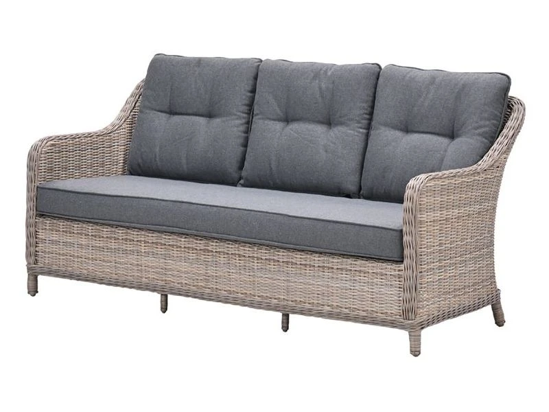 De bank heeft een robuust aluminium frame, omwikkeld met handgevlochten kunststof wicker, wat een verfijnde en elegante look geeft. De materialen die gebruikt zijn, zijn ideaal voor buitengebruik.