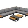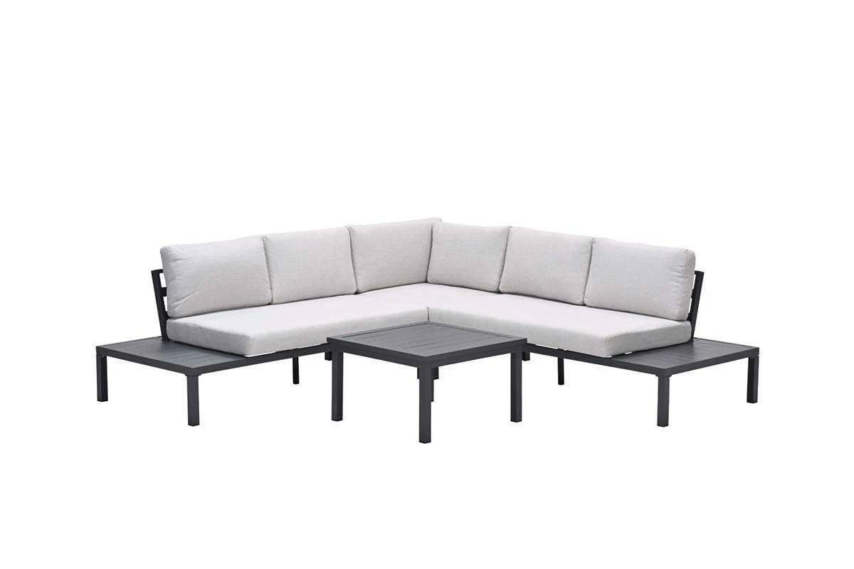 De hoekbank en tafel zijn volledig gemaakt van aluminium, met frames die zijn beschermd tegen weersinvloeden door een poedercoating.