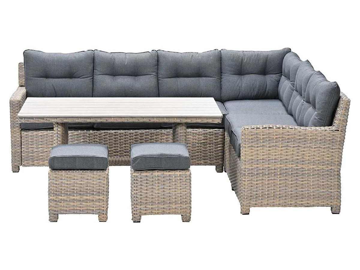 Lounge-dining betekent dat de zithoogte van de bank en de hoogte van de tafel perfect zijn voor zowel comfortabel dineren als heerlijk loungen. De set heeft een stevig en lichtgewicht aluminium frame, omwikkeld met handgevlochten L-shape wicker voor een robuuste uitstraling. Dit kunststof vlechtdraad is sterk, onderhoudsvriendelijk en bestand tegen diverse weersomstandigheden. De comfortabele kussens worden standaard meegeleverd en zijn voorzien van een waterafstotende coating, waardoor je eenvoudig waterdruppels van de kussens kunt afkloppen.