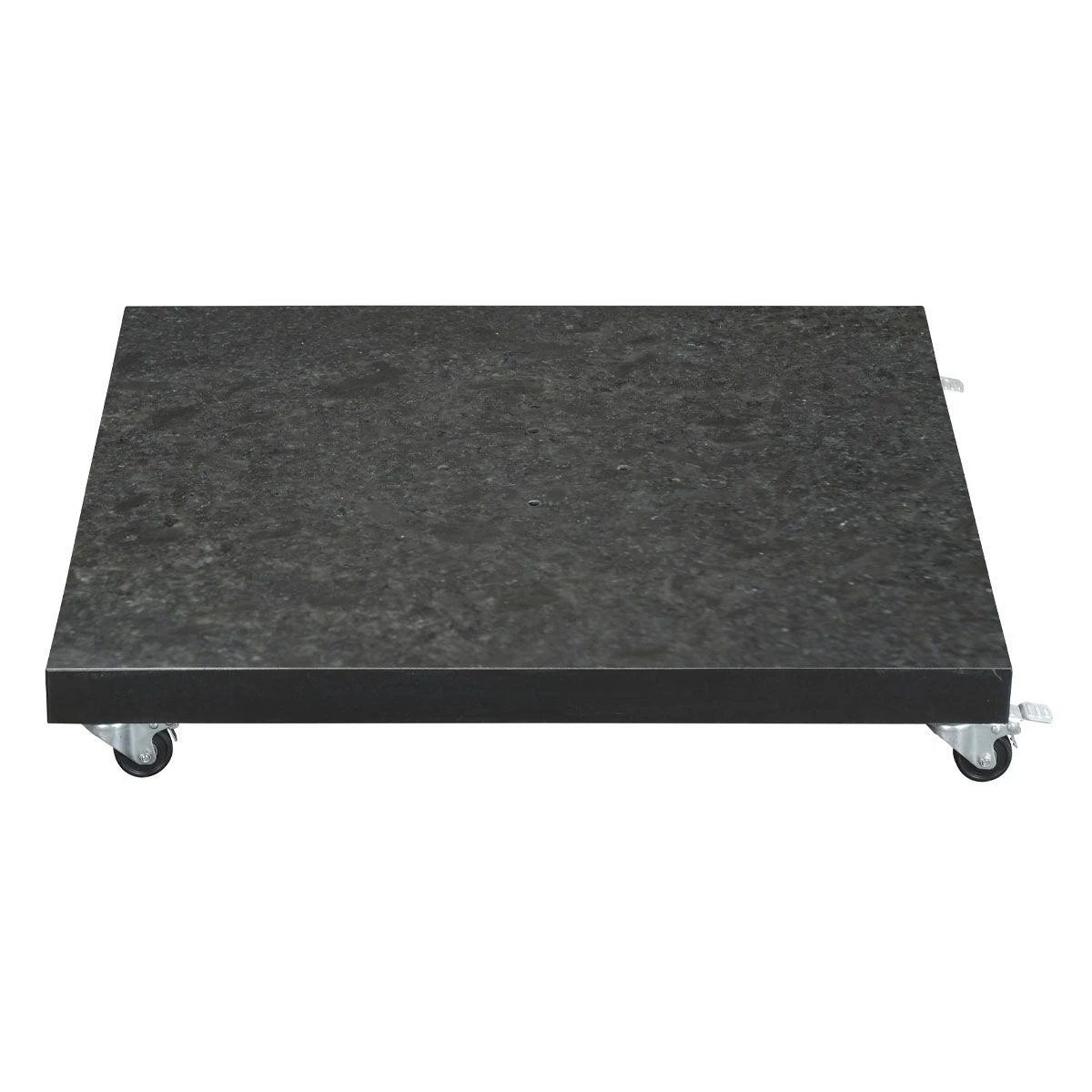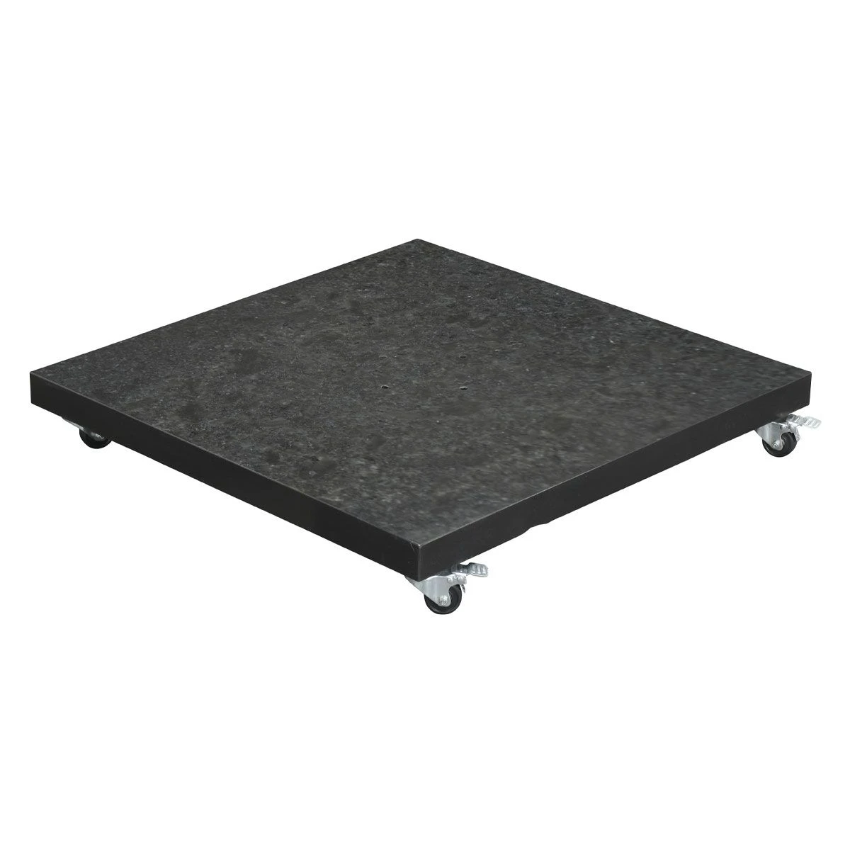 Deze parasolvoet is vervaardigd uit antraciet kleurig graniet waarvan de bovenzijde is gepolijst, waardoor de voet een strakke en luxe uitstraling krijgt. De voet is voorzien van vier nylon wielen in crème kleur, waarmee je de parasolvoet kunt verplaatsen. Kortom, de stijlvolle look van hoogwaardig natuursteen met het gemak van een verrijdbare parasolvoet. De Hawaii parasolvoet 90 kg is geschikt voor alle reguliere Hawaii parasols van Garden Impressions ook voor de Hawaii S parasol. De afstand van de vier voorgeboorde gaten voor de montage van de parasol op de voet bedraagt 11,5 cm. Voor iedere Hawaii parasol is dit hetzelfde. Het is goed om bij de aanschaf van de juiste parasolvoet goed te kijken naar het gewicht. Staat er veel wind of wordt de parasol op een dakterras geplaatst, dan is het verstandig om een zwaardere voet aan te schaffen. Per Hawaii zweefparasol staat vermeld welk tegenwicht deze minimaal nodig heeft voor de parasolvoet. Twijfel je? Neem gerust contact met ons op voor persoonlijk advies. Graniet is een natuurproduct wat zijn eigen unieke kenmerken heeft. Het kan voorkomen dat in de granieten parasolvoet een ader van de steen zichtbaar is. Dit doet geen afbreuk aan de kwaliteit van het product. De Hawaii parasolvoet is in gangbare formaten verkrijgbaar: 60, 80, 90, 120 en 150 kg. De parasolvoet is in drie kleuren verkrijgbaar: antraciet, gemengd grijs en zwart.