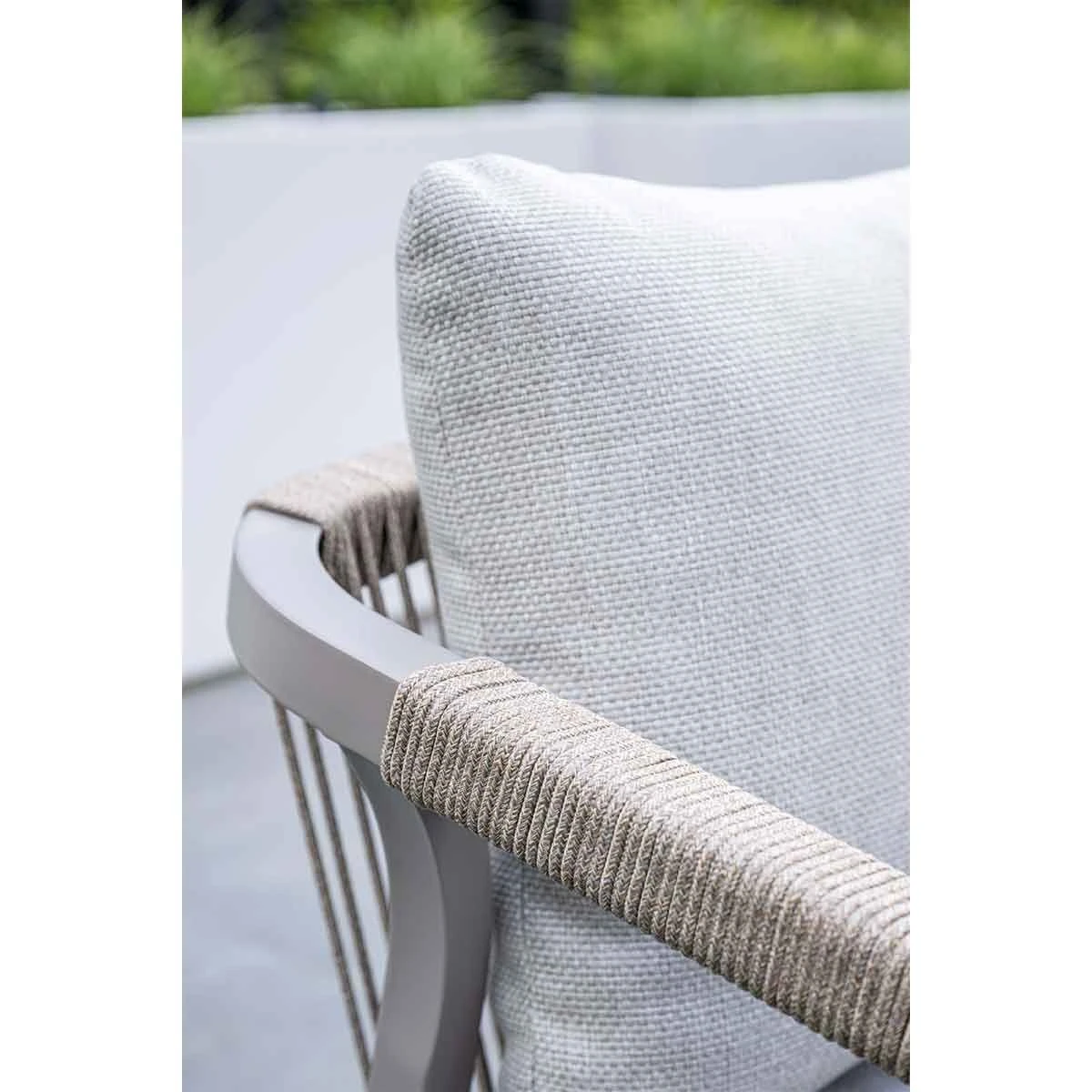 De Tarera lounge dining stoel is gemaakt van aluminium en afgewerkt met touw. De rugleuning is gemaakt van grijs kleurig rope. Dit touw is te vergelijken met touw dat in de scheepsvaart gebruikt wordt. Het touw is voorzien van een rubberen kern binnenin met daarin meerdere polyester draden voor de stevigheid. Om de rubberen kern zit solution dyed polyester rope. Dit betekent dat het touw door en door gekleurd is en verkleurt veel minder snel. Het meegeleverde kussen is gemaakt van hoogwaardig kwaliteit polyester. Het zitkussen is voorzien van een rits waardoor de hoes gemakkelijk met de hand kan worden gewassen. Het kussen is niet waterbestendig en kan het beste na gebruik worden opgeborgen in de schuur of in een kussenbox. Wel is het kussen voorzien van een waterafstotende coating. Dit is vooral erg praktisch als er bijvoorbeeld op het kussen wordt gemorst met drinken, je veegt het vocht er namelijk gemakkelijk weer af.