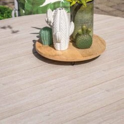 De tuinstoel heeft een afmeting van 60 bij 64 cm en is 75 cm hoog. De tuintafel is Ø148 cm en heeft een hoogte van 75 cm. Het tafelblad is gemaakt van Vironwood latten, dit is een onderhoudsvriendelijke kunststof met een mooie houtuitstraling.