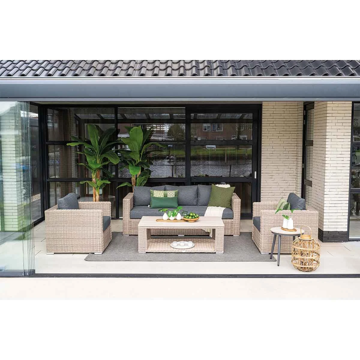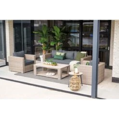 Het onderhoud van de loungeset is eenvoudig. Het aluminium frame maak je schoon met een sopje en zachte spons, waarna je het droogt met een pluisvrije doek. Het wicker reinig je met een geschikte cleaner en spoel je goed af met water. Na droging kun je het wicker behandelen met een beschermer om het soepel te houden, aanbevolen twee keer per seizoen.