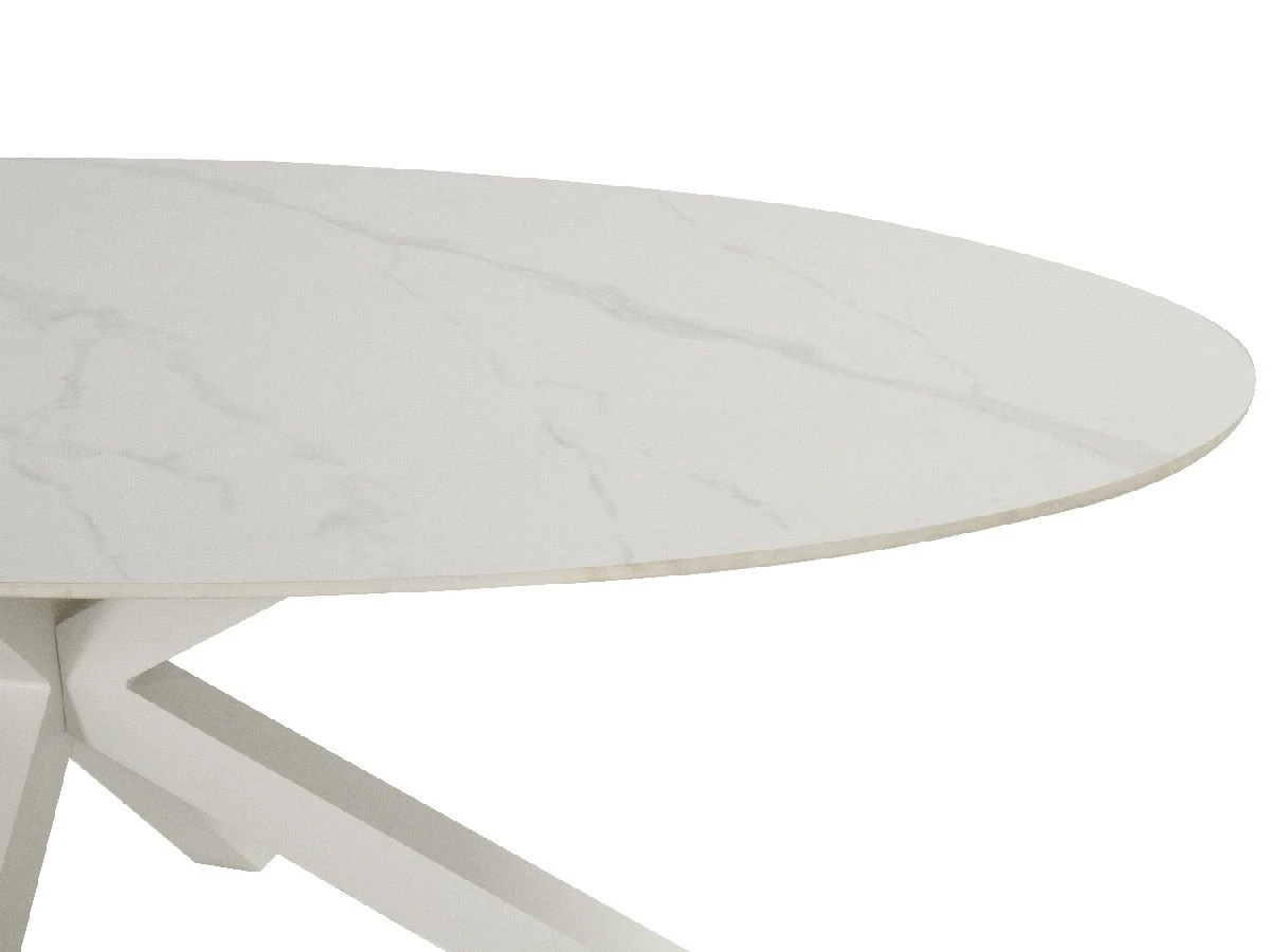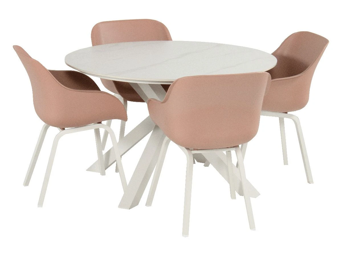 De tafel heeft een afmeting van ø120 x 76 cm en bestaat uit een stevig aluminium onderstel, met een uit keramiek vervaardigde blad.