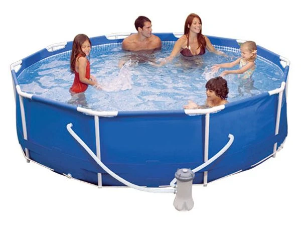 Het zwembad heeft een metalen frame en een stevig doek van PVC. Het zwembad is voorzien van aansluitpunten voor een filtersysteem. De filterpomp wordt standaard meegeleverd en zorgt ervoor dat het water rond gepompt en gefilterd wordt. Zo kunnen jullie extra lang genieten van schoon zwembadwater!