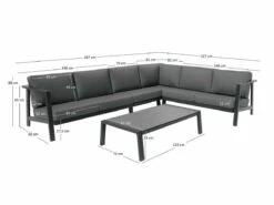 De Kettler Alba corner loungeset heeft een afmeting van 297 x 227 x 80 cm en biedt voldoende ruimte om heerlijk te loungen. De kussens zijn vervaardigd uit 100% olefin, wat zorgt voor een zachte en comfortabele zit ervaring, terwijl ze ook bestand zijn tegen de elementen. De bijpassende loungetafel, met afmetingen van 123 x 72 x 33 cm, is perfect voor het serveren van drankjes en snacks, en het tafelblad van glas met een keramische coating voegt een elegante touch toe aan het geheel.
