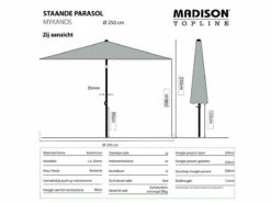 Het parasoldoek is gemaakt van 100% polyester (180g/m²) met een PA-coating, wat zorgt voor een waterafstotende werking en langdurige duurzaamheid in de buitenlucht. De parasol heeft 6 stevige baleinen en een stokdiameter van 35 mm, wat zorgt voor stabiliteit en stevigheid.