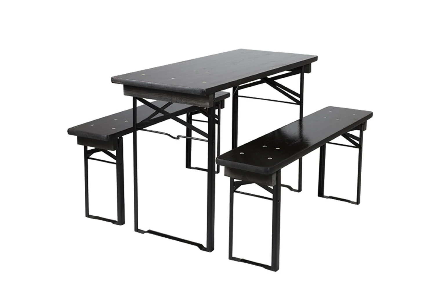 Inklapbare zwarte biersets zijn geproduceerd voor binnen. De zittingen en bladen zijn gemaakt uit verlijmd hout zodat de banken en tafel eenvoudig zijn schoon te maken. Geverfde verlijmde producten zijn echter niet bestand tegen buiten gebruik, de zittingen en bladen kunnen dan gaan scheuren. Hierop verlenen we dan ook geen garantie. Zoek je een inklapbare set die je wel buiten kunt gebruiken? Kijk dan eens naar onze inklapbare Hamburg en Riga tuinsets.