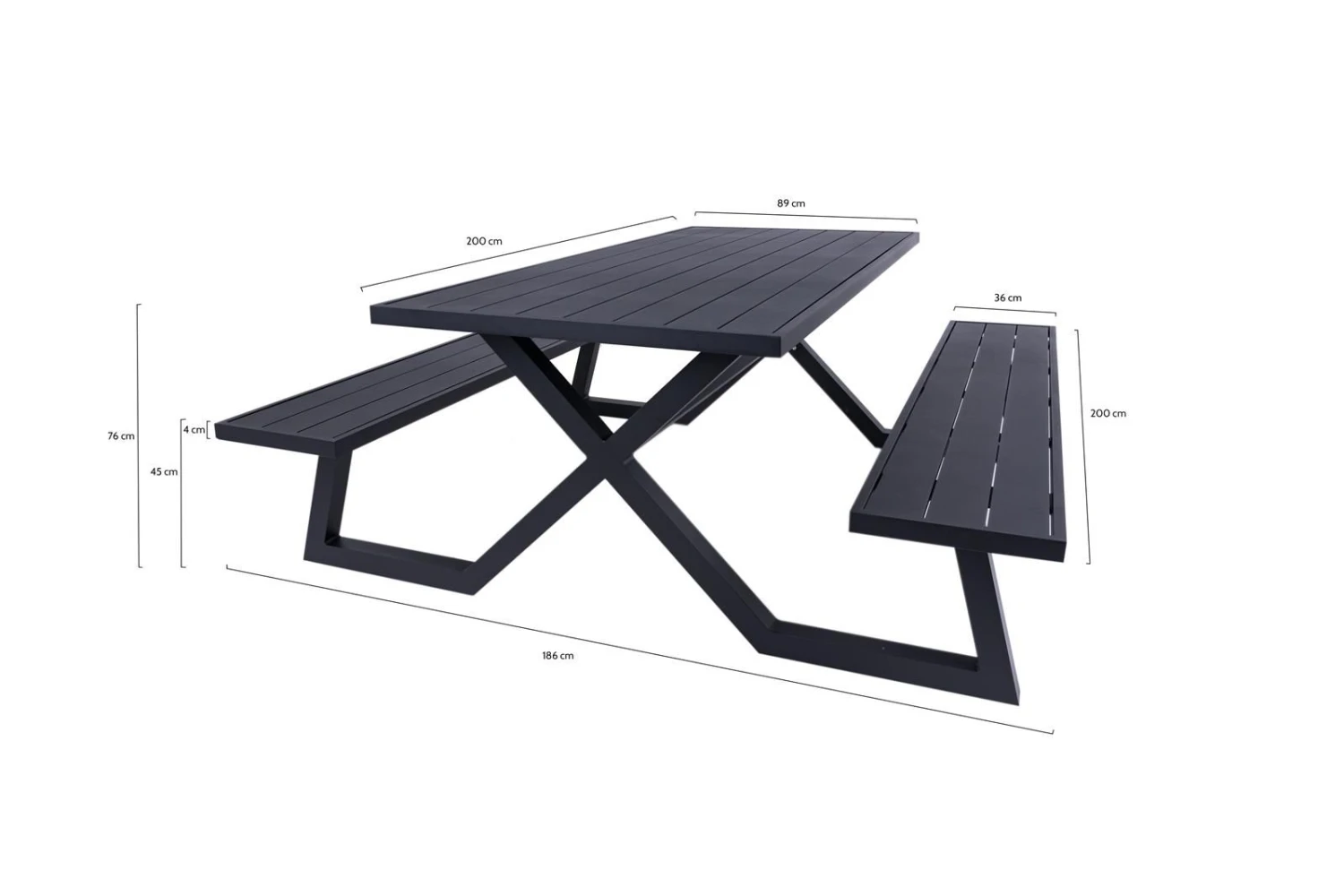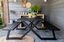 – Verkrijgbaar in 2 kleurenDeze zwarte aluminium picknicktafel van 200 cm is een designtopper waarbij modieuze vormgeving, betaalbaarheid en comfort samengaan. De onderhoudsarme tafel heeft een elegante en makkelijke instap en is door zijn lichtgewicht eenvoudig te verplaatsen in je kantoor, tuin of op je dakterras. Een echte eyecatcher die door eigen import geen duizenden euros meer hoeft te kosten!Tip van ons: Op de zittingen van deze luxe picknickbank passen onze 5 cm dikke picknicktafel kussens van 200 cm. Materiaal