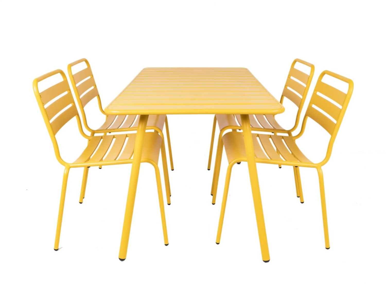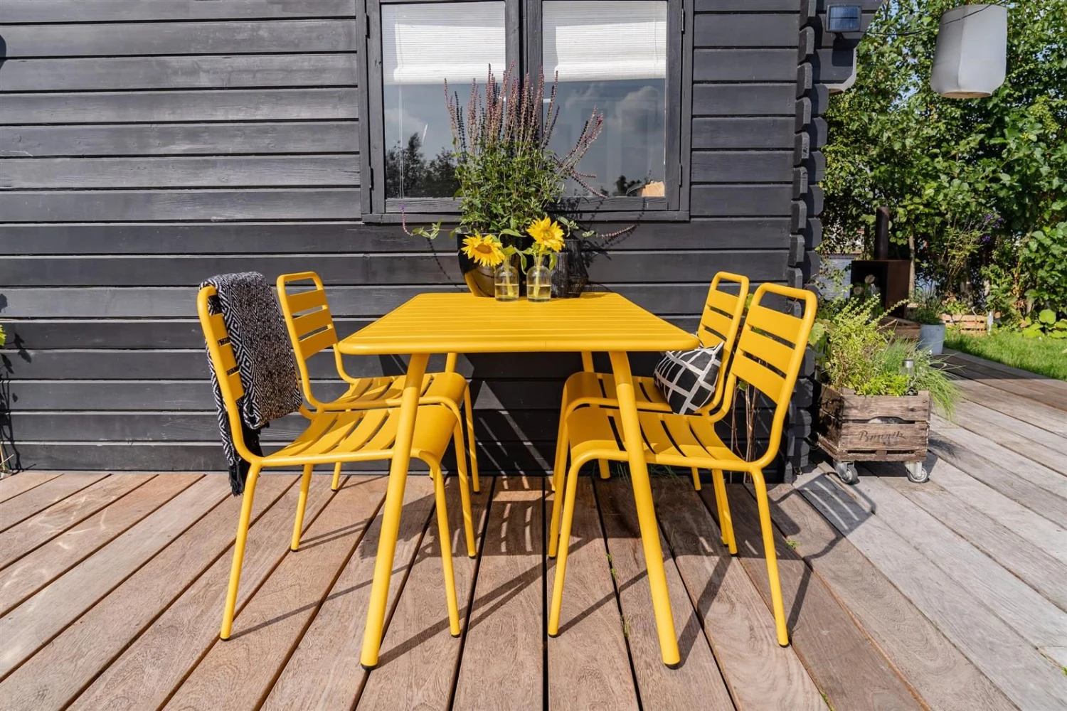 – Leverbaar in meerdere kleuren De kleur geel stemt vrolijk en positief. Wist je dat het wetenschappelijk is bewezen dat je vrolijk wordt van de kleur geel? Wat wil je nog meer! Wij hebben gekozen voor de kleur okergeel, omdat deze in je exterieur heel mooi is te combineren met andere warme kleuren zoals legergroen, roestbruin en bordeaux rood. Tip van ons: Voor de stoelen zijn er comfortabele zitkussens in diverse vrolijke prints verkrijgbaar. Materiaal