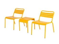 Je ontvangt 2 stoelen in 1 doos met de afmetingen van 67x 57x 17cm. De stoelen wegen per stuk zo’n 11 kg. Het MaximaVida metalen bijzettafeltje Max 45cm okergeelwordt geleverd in een doosvan 53x 51x 13cm en weegt 8kg.Uiteraard kun je zoveel sets bestellen als je wilt, bestel je er meer dan 8 dan wordt het op een pallet verstuurd.Opbouw