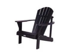 Deze set bestaat uit twee zwarte kunststof Adirondack tuinstoelen met bijpassende voetenbankjes en een kunststof sidetable.