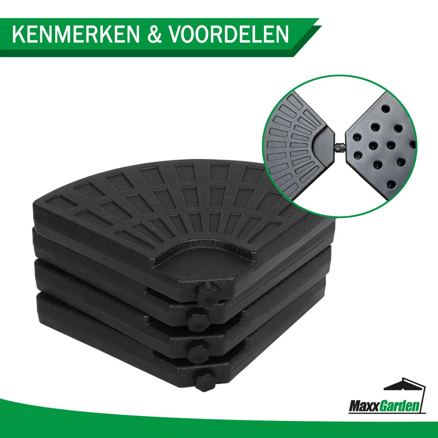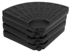De vier delen vul je met 15 kilogram zand of water. De losse delen berg je opgestapeld ruimtebesparend op