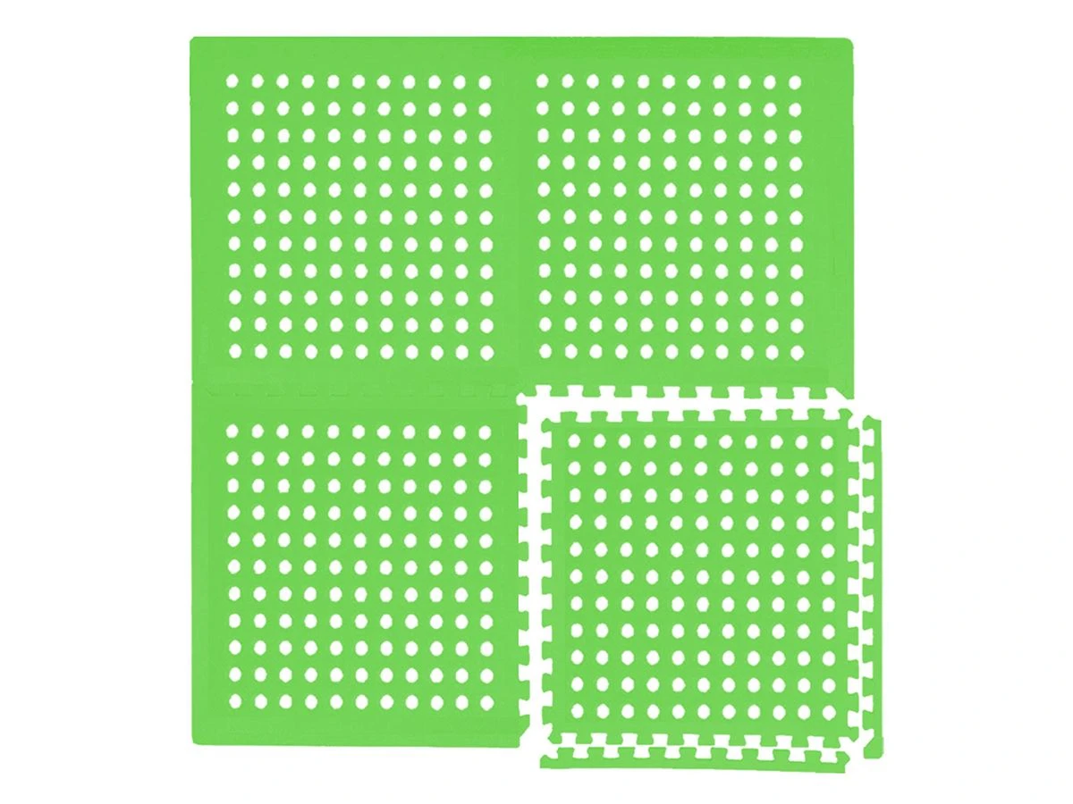 De vloermatten beveiligen de gladde vloer aan de rand en de ingang bij de trap – het water loopt gewoon weg door de gaten.