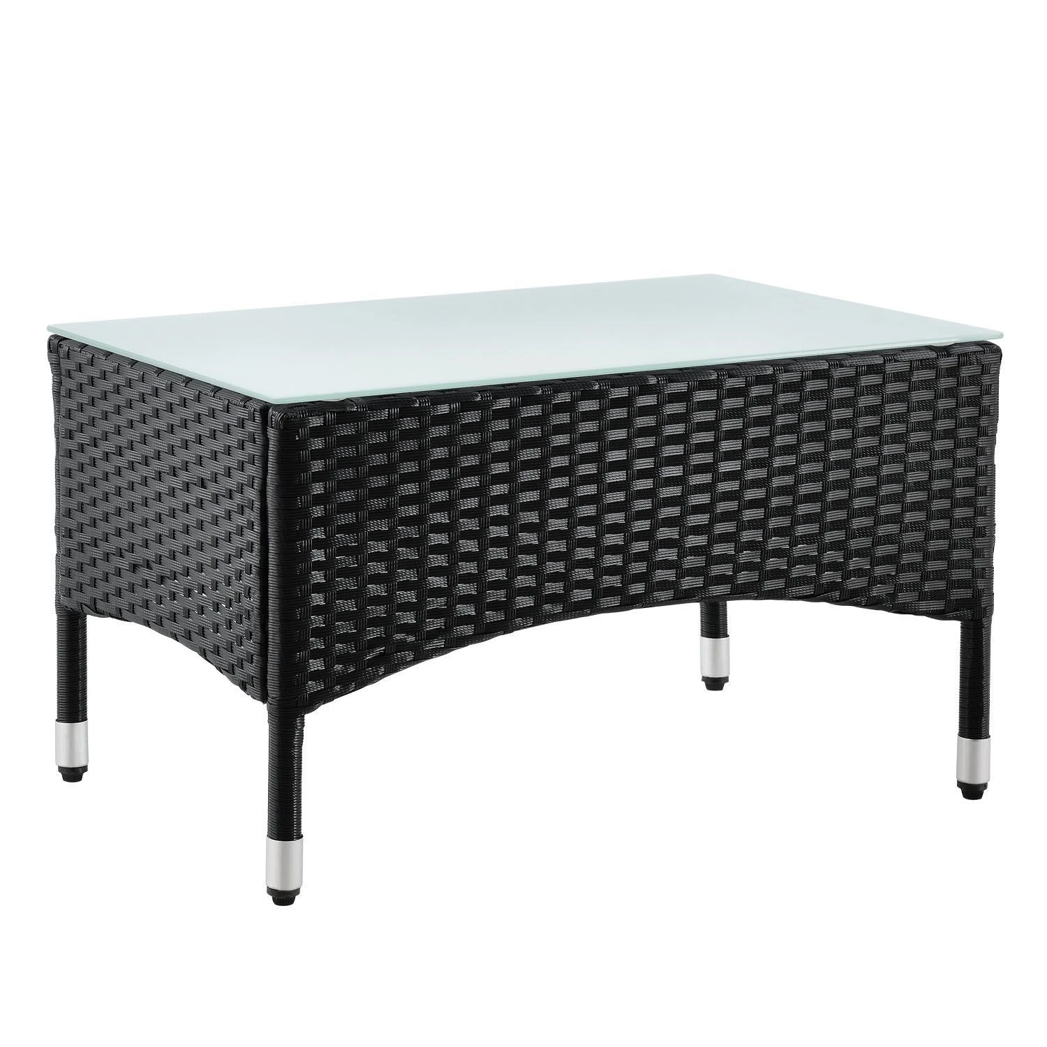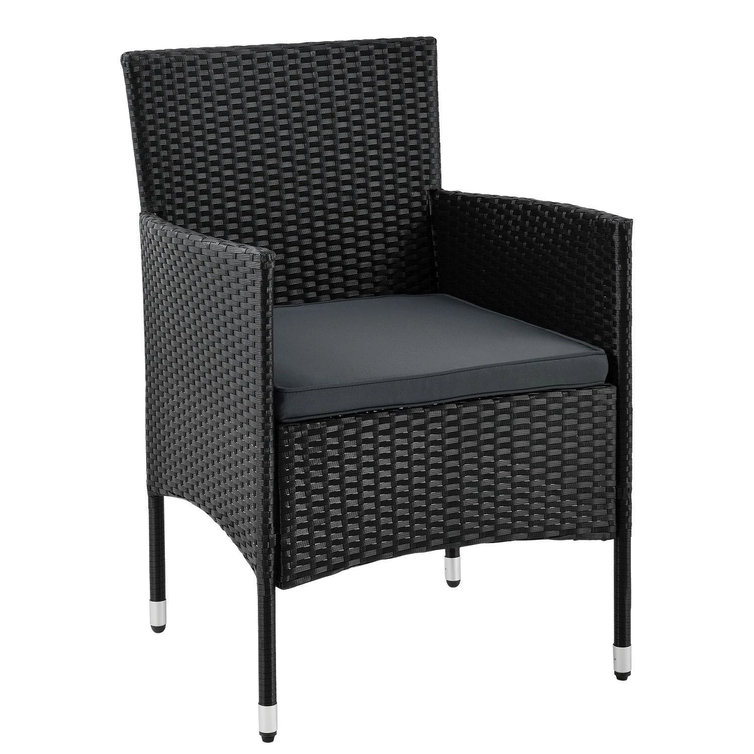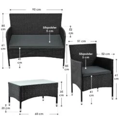 De poly rotan zitgroep Fort Myers (zwart met donkergrijze hoezen) dient als comfortabele lounge voor 4 personen. Met de edele rotan-look verfraait hij elke tuin, terras of balkon. Uitgerust met een rugleuning en kussens, is de tuinset perfect om vele uren door te brengen met familie en vrienden. De 4-delige tuinmeubelset met stevig metalen frame bestaat uit een 2-zitsbank, twee fauteuils en een klein bijzettafeltje met een glazen blad. De balkonset is geschikt om gasten in stijl te ontvangen. Zet drankjes en hapjes op tafel en geniet samen van de zomer.