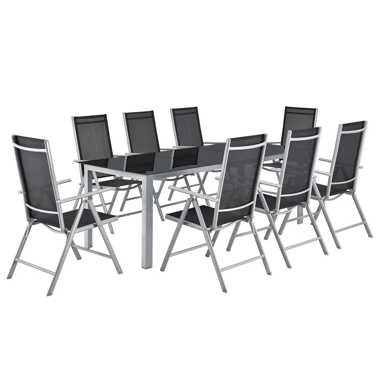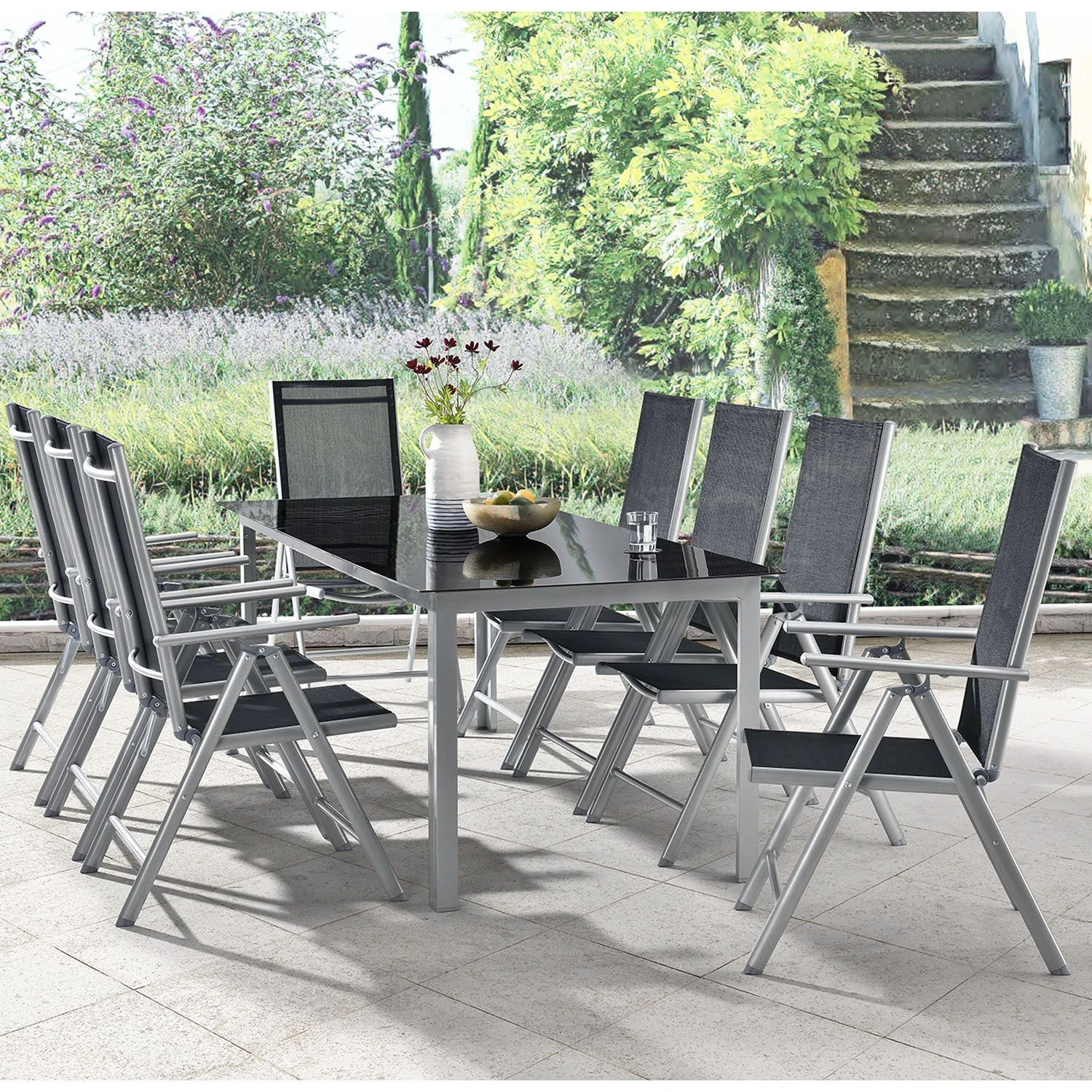 De 9-delige aluminium tuinset Milano met een grote tafel en zes stoelen is een perfecte zomerse begeleider voor liefhebbers van frisse lucht. Breng spelavonden, brunch- en koffiekransen, kleurrijke kinderverjaardagsfeestjes en grote barbecuefeesten door bij je nieuwe eetgroep. De montage is snel gedaan en de lichte tuinmeubelen zijn in een mum van tijd te vervoeren. De supereenvoudige reiniging en verzorging duurt niet lang na elk feest. Klap je stoelen met één hand op en alle sporen zijn verdwenen.