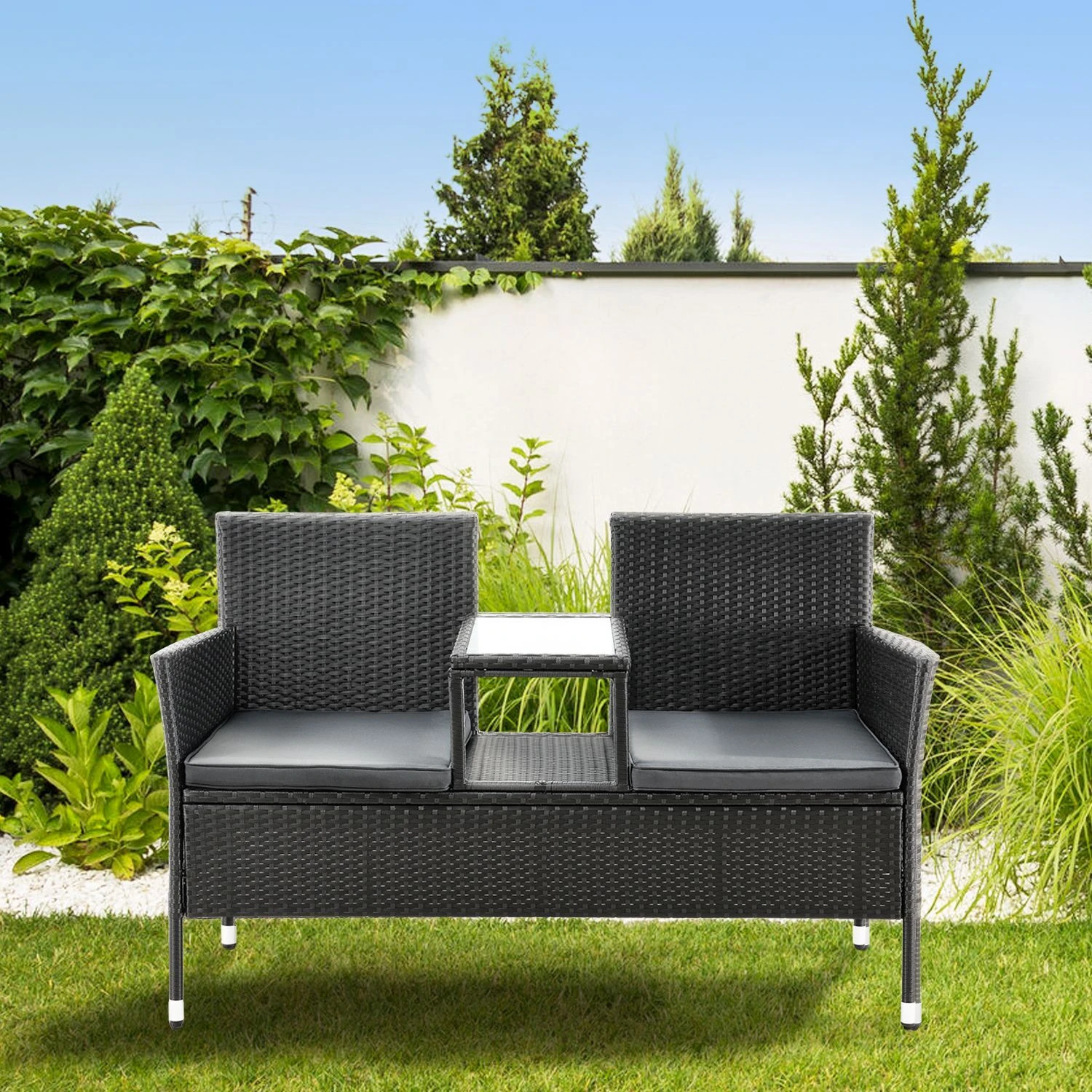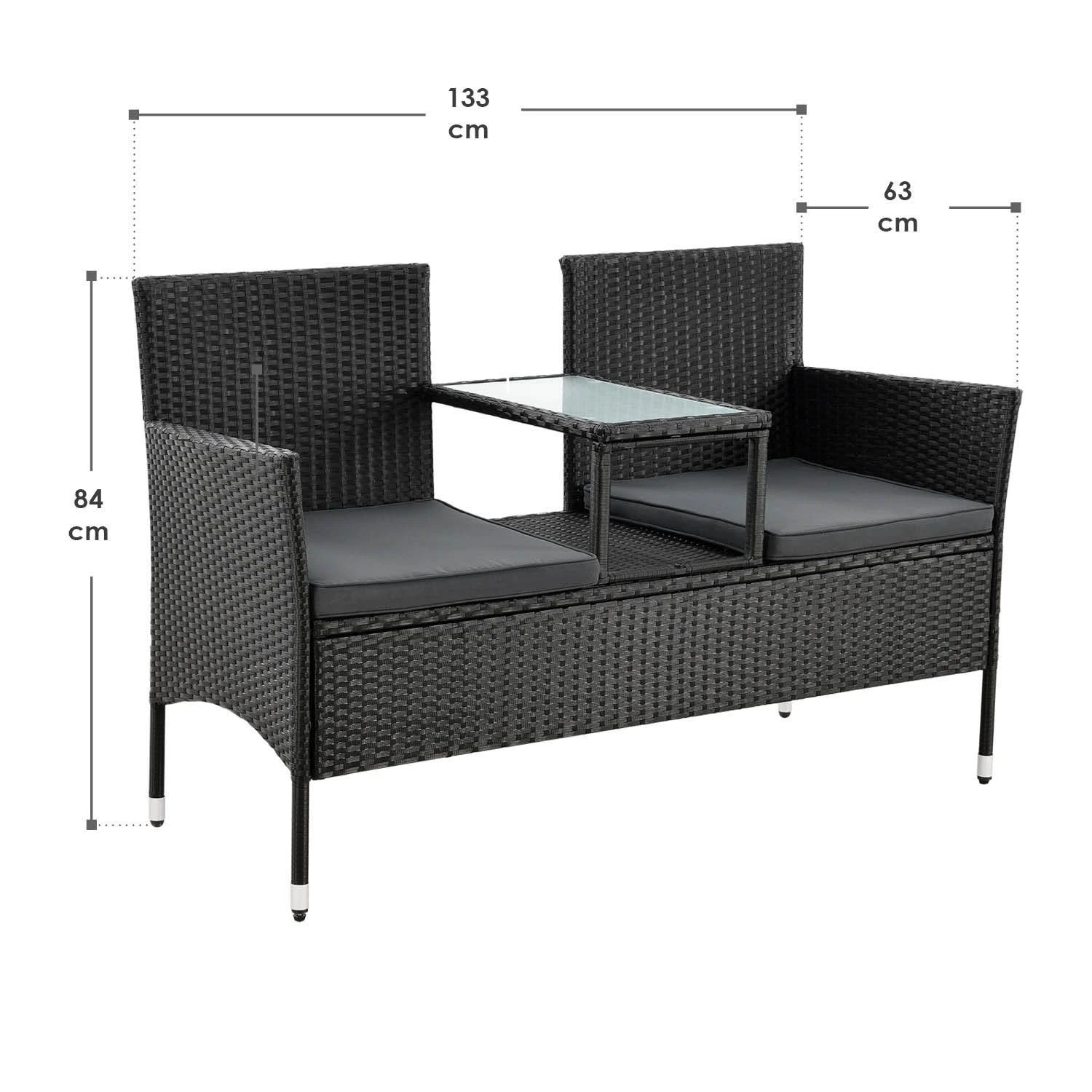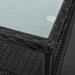 Bent u op zoek naar een stijlvolle zitmogelijkheid voor uw balkon, tuin of terras die comfortabel en ruimtebesparend is? Kies dan voor de moderne poly rotan bank Monaco in het zwart met donkergrijze zitkussens. De kleine tuinbank voor 2 personen neemt buiten weinig ruimte in beslag (133 × 63 × 84 cm) en is daarom ideaal als balkonmeubel. De 2-zitsbank in rotan look ziet er ook modern en tijdloos uit bij de vijver, het zwembad of onder een boom. Het trendy poly rattan weefsel is onderhoudsvriendelijk en zorgt samen met het dikke zitkussen voor een zacht zitgevoel. Zet drankjes of snacks op het kleine tafeltje in het midden.
