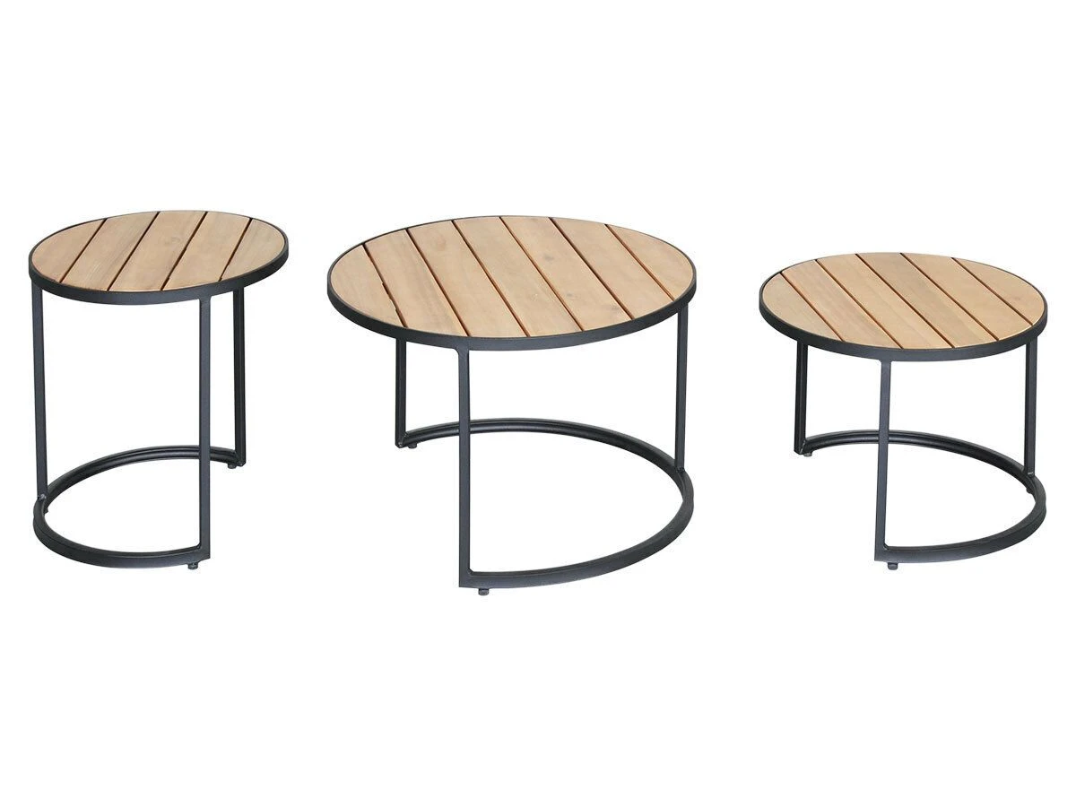 De drie verschillende tafels hebben een afmeting van Ø 39 x 46 cm, Ø 45 x 35 cm en Ø 58 x 48 cm. Het zwarte frame is vervaardigd uit aluminium met daarop een blad van acaciahout. Acaciahout is een hardhoutsoort met een fijne nerf en een warme kleur. Deze duurzame houtsoort is makkelijk in onderhoud. Om de warme uitstraling te behouden en het hout te beschermen tegen verschillende weersinvloeden raden wij aan om ze zeker ieder jaar met olie te behandelen.