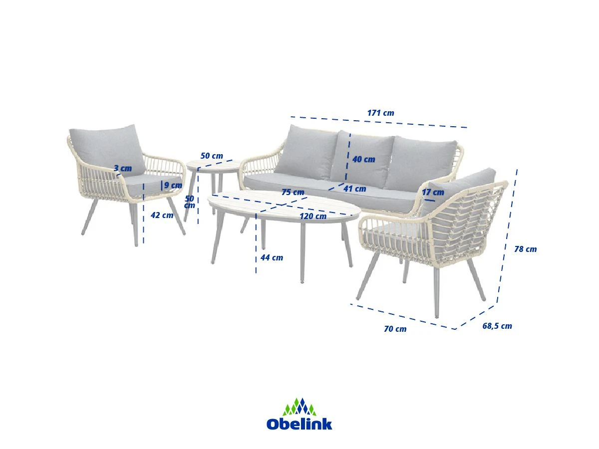 De bank heeft een afmeting van 171 x 68 x 78 cm, de stoelen hebben een afmeting van 68 x 68,5 x 78 cm, de bijzettafel heeft een afmeting van Ø 50 x 48 cm en de tafel heeft een afmeting van 120 x 75 x 45 cm.
