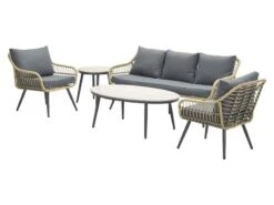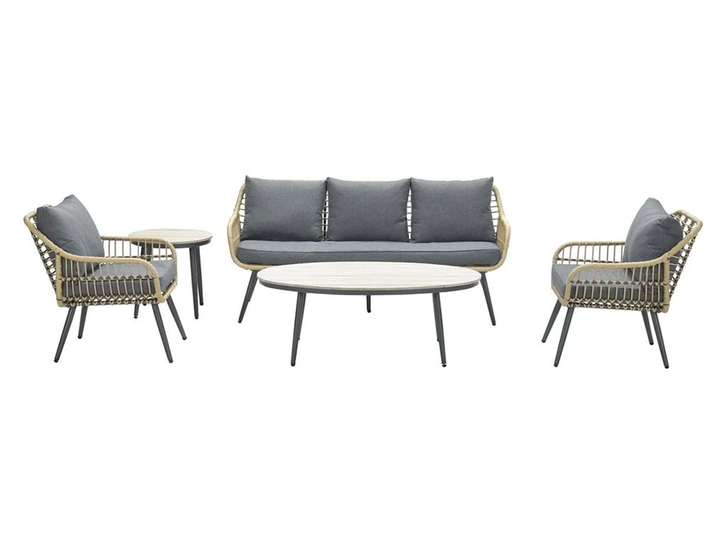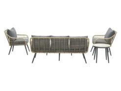 De Daisy loungeset heeft een aluminium frame en is afgewerkt met gevlochten wicker. Deze kunststof vlechtdraad is sterk en weerbestendig. De tafelbladen zijn gemaakt van polywood, dit is een sterke kunststof vezel met een houtlook. De rug- en zitkussens zijn voorzien van een waterafstotende coating en een ritssluiting. We raden aan om de kussens bij langdurige regen en tijdens de winterperiode droog en vorstvrij op te bergen.