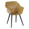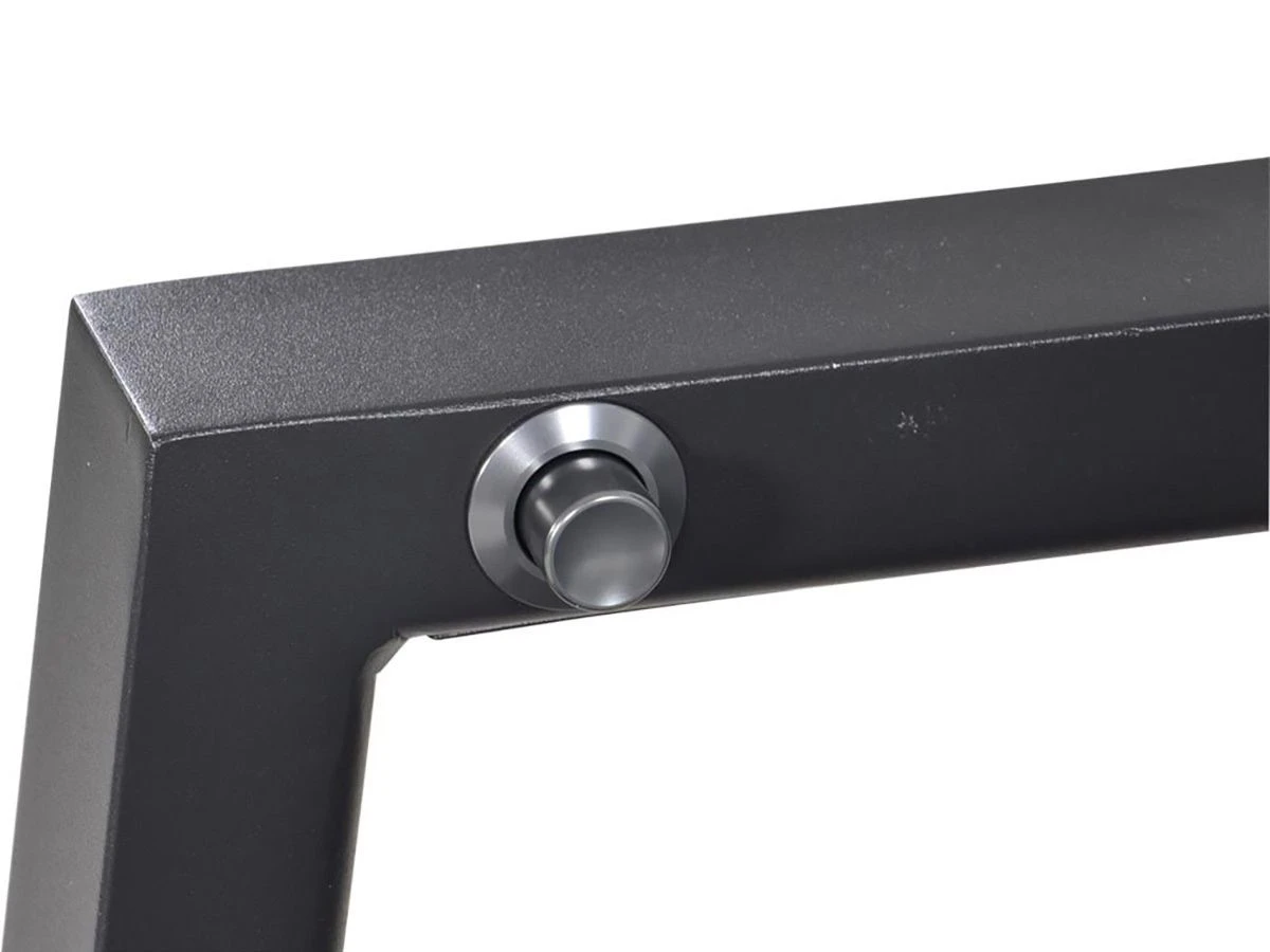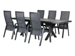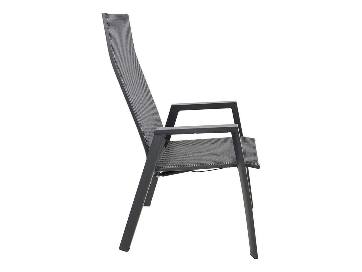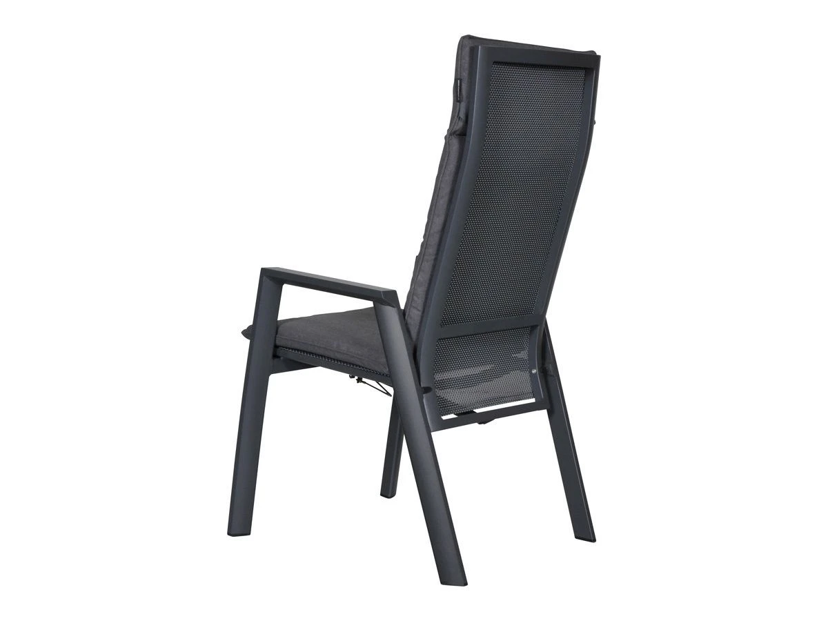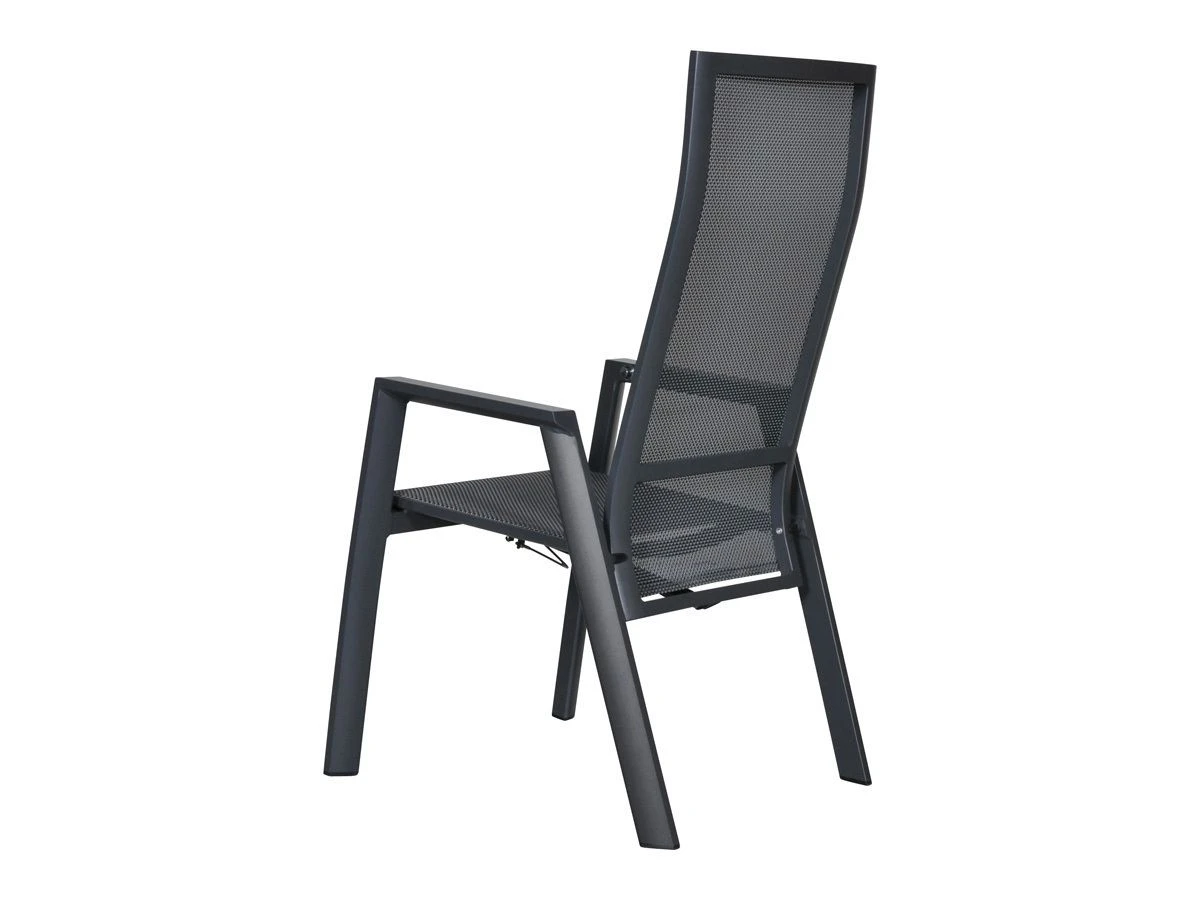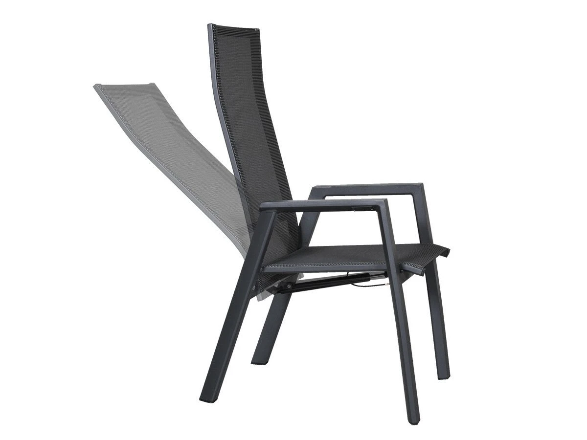 De stoel heeft een afmeting van 59.5 x 70 x 112 cm met een zithoogte van 45 centimeter. Het frame is gemaakt van aluminium in een matte antraciet kleur. De zitting is gemaakt van weerbestendig textileen en het verstelmechanisme werkt door middel van een gasveer.