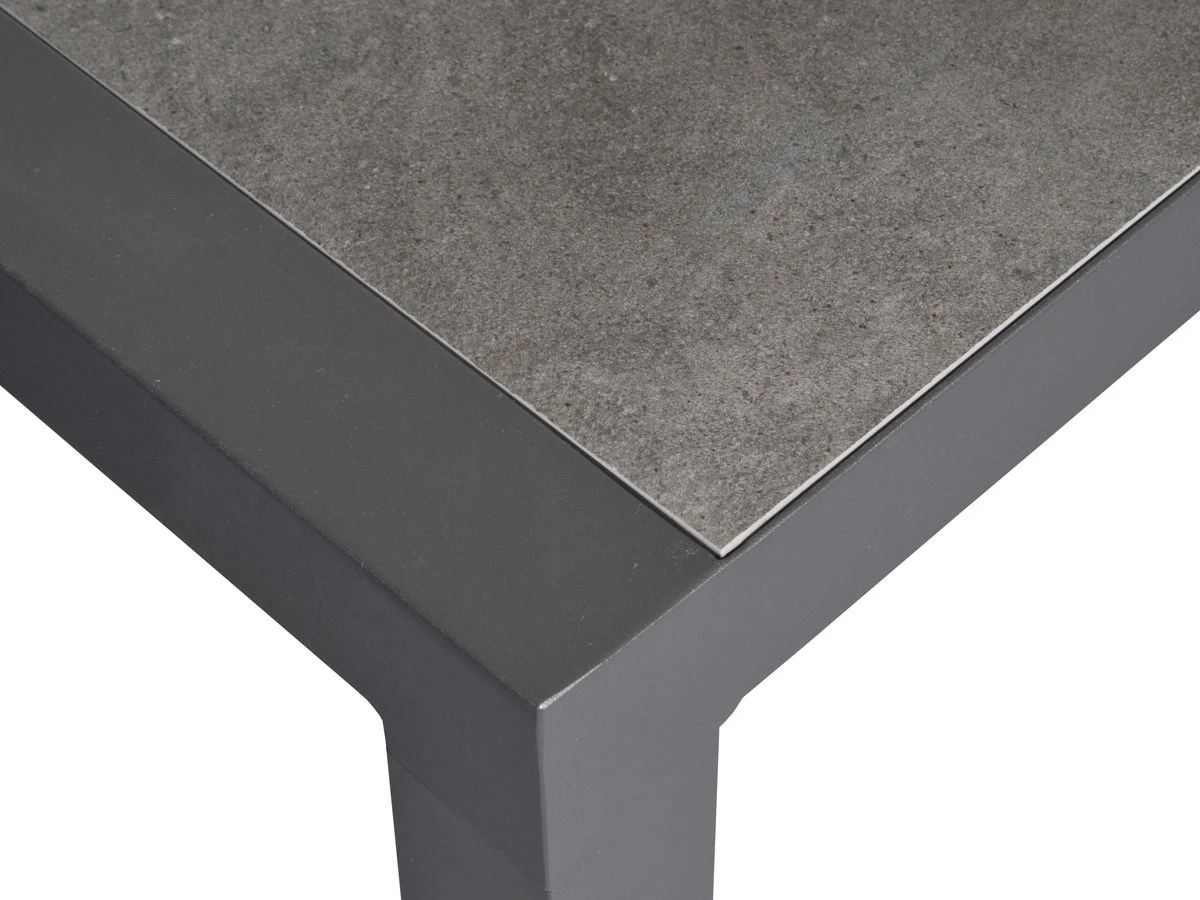 De tafel met een afmeting van 120 x 70 x 43 cm en heeft een aluminium frame. Het blad bestaat uit keramiek.