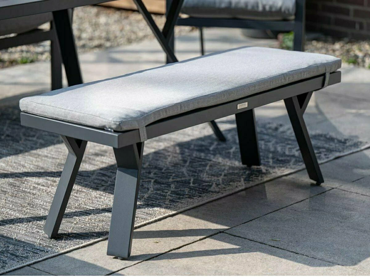 De bank is gemaakt van aluminium en is een leuke toevoeging aan je loungeset. De afmeting is 110 x 40 x 42 cm. De bank wordt geleverd inclusief een lichtgrijs polyester zitkussen.