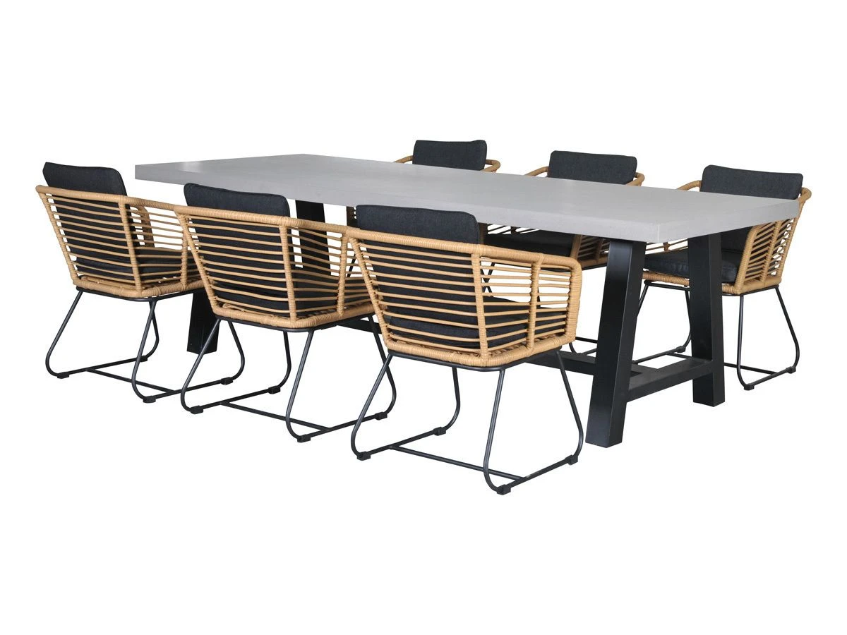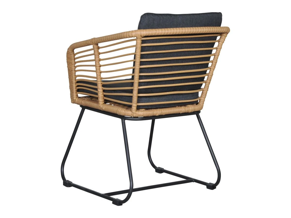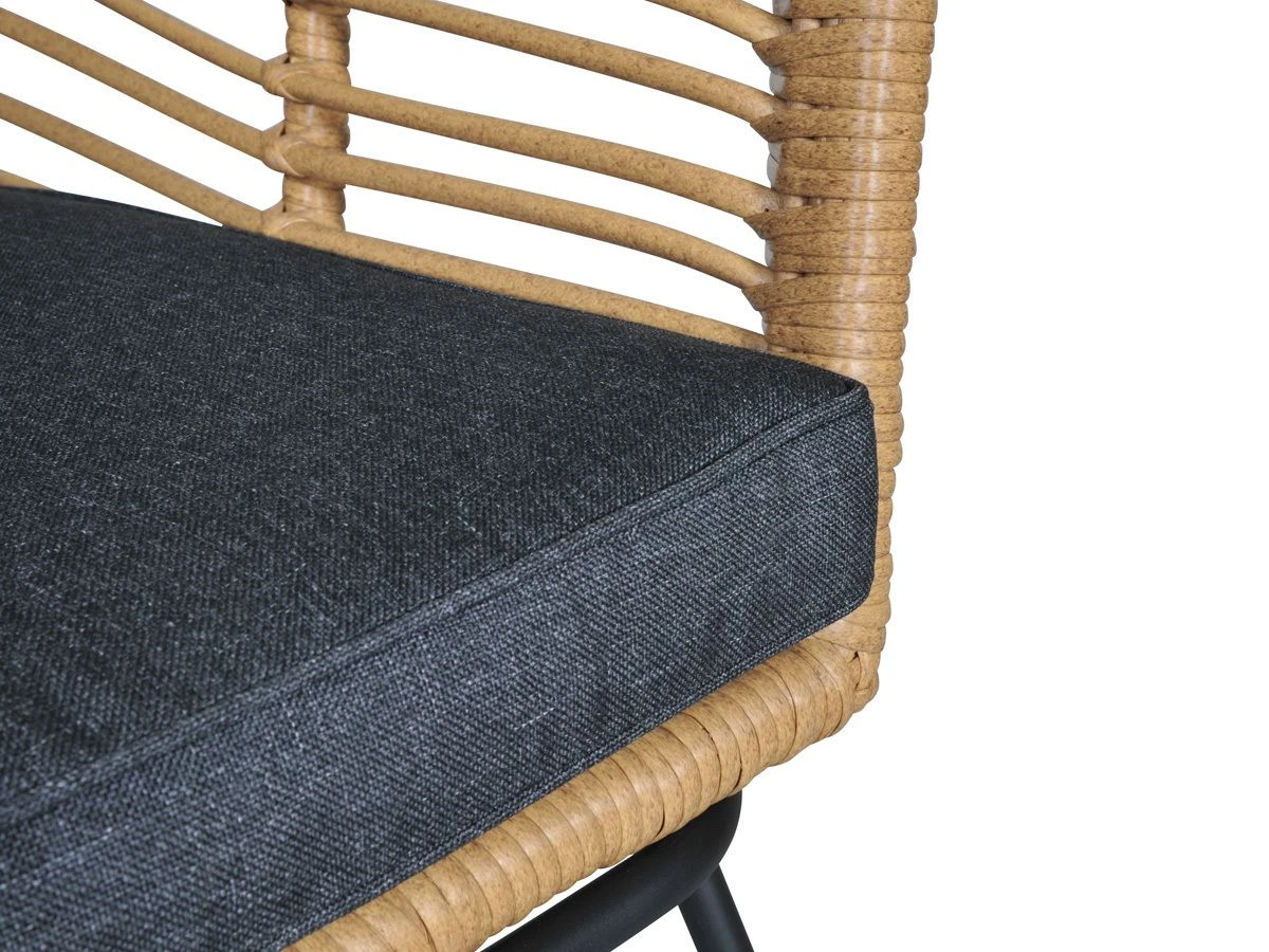 De zitting is gemaakt van kunststof wicker, met daaronder een gecoat stalen frame. De polyester kussens zijn waterafstotend waardoor een korte regenbui geen probleem is. Het zitkussen is voorzien van een rits, hierdoor is de kussenhoes eenvoudig schoon te maken.