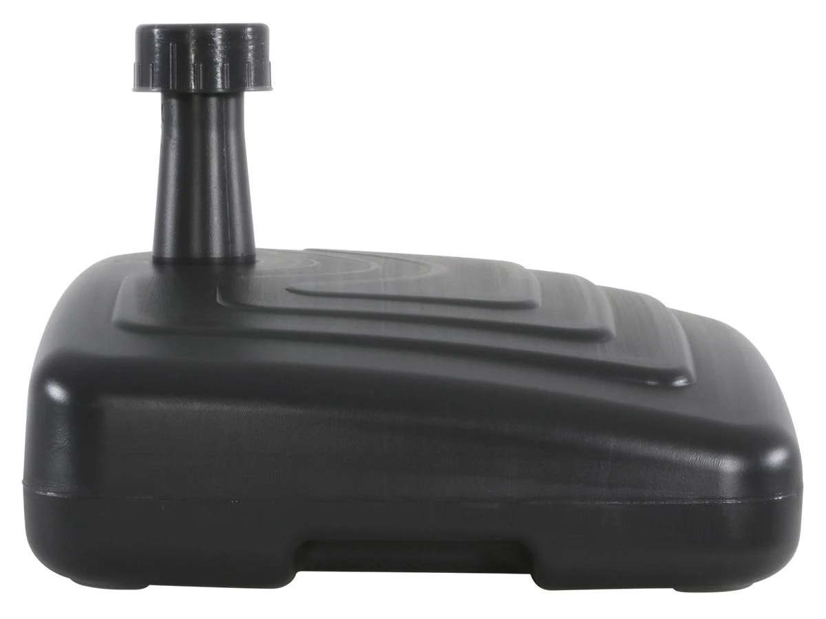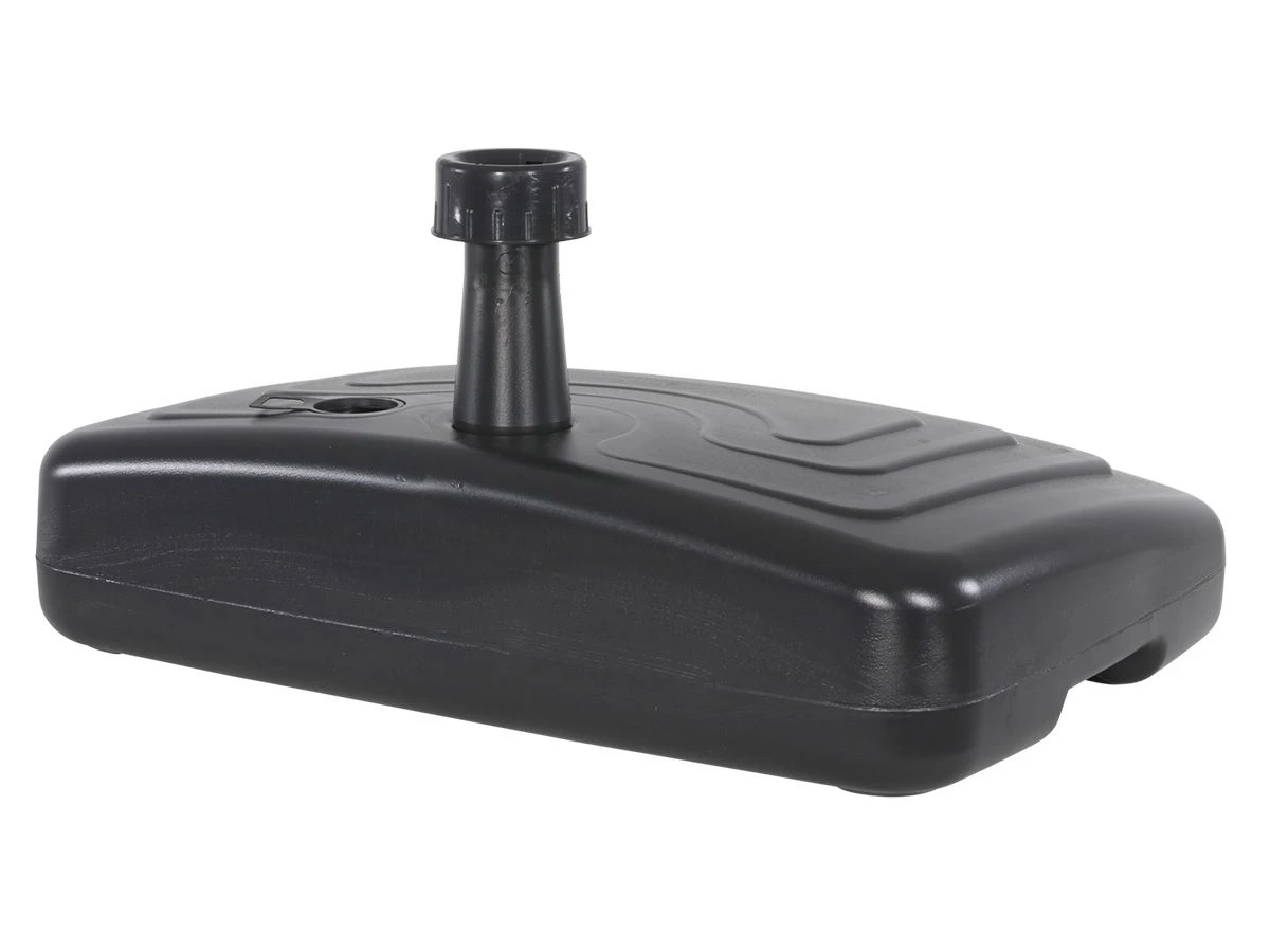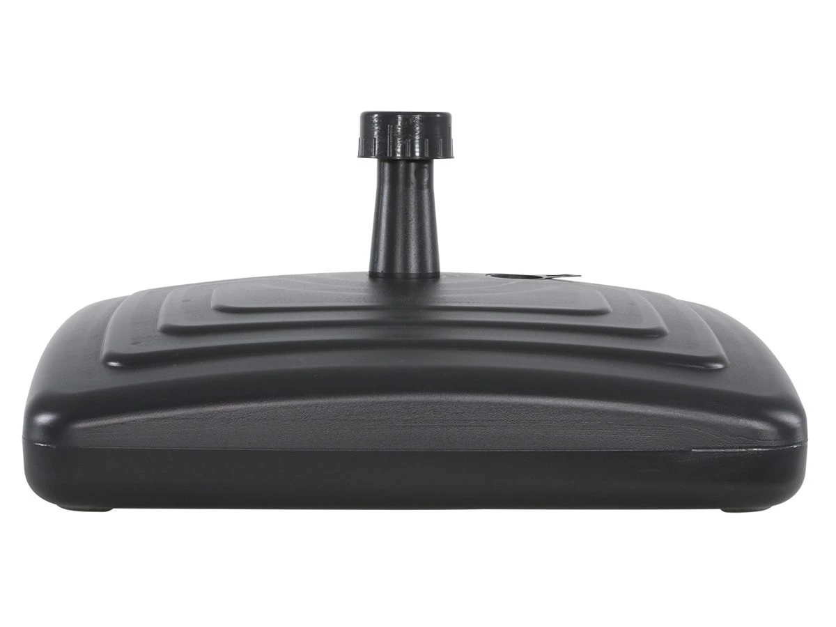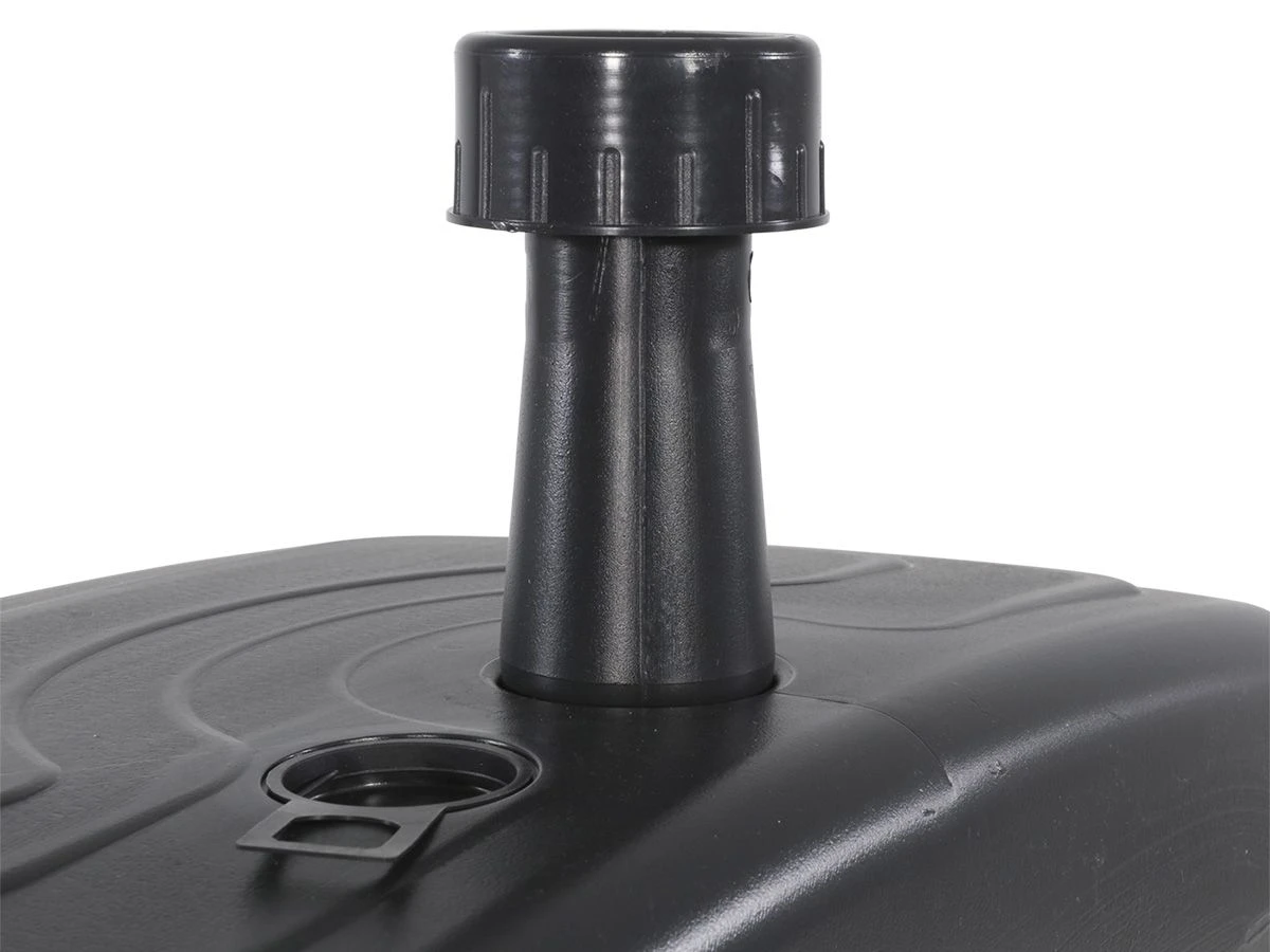 Deze vulbare parasolvoet moet gevuld worden met 20 liter zand of water. En is geschikt voor stokken met een doorsnede van 20 tot 38 mm. De afmeting is ongeveer 56 x 39 x 11 cm, de stok is onder in de voet op te bergen.