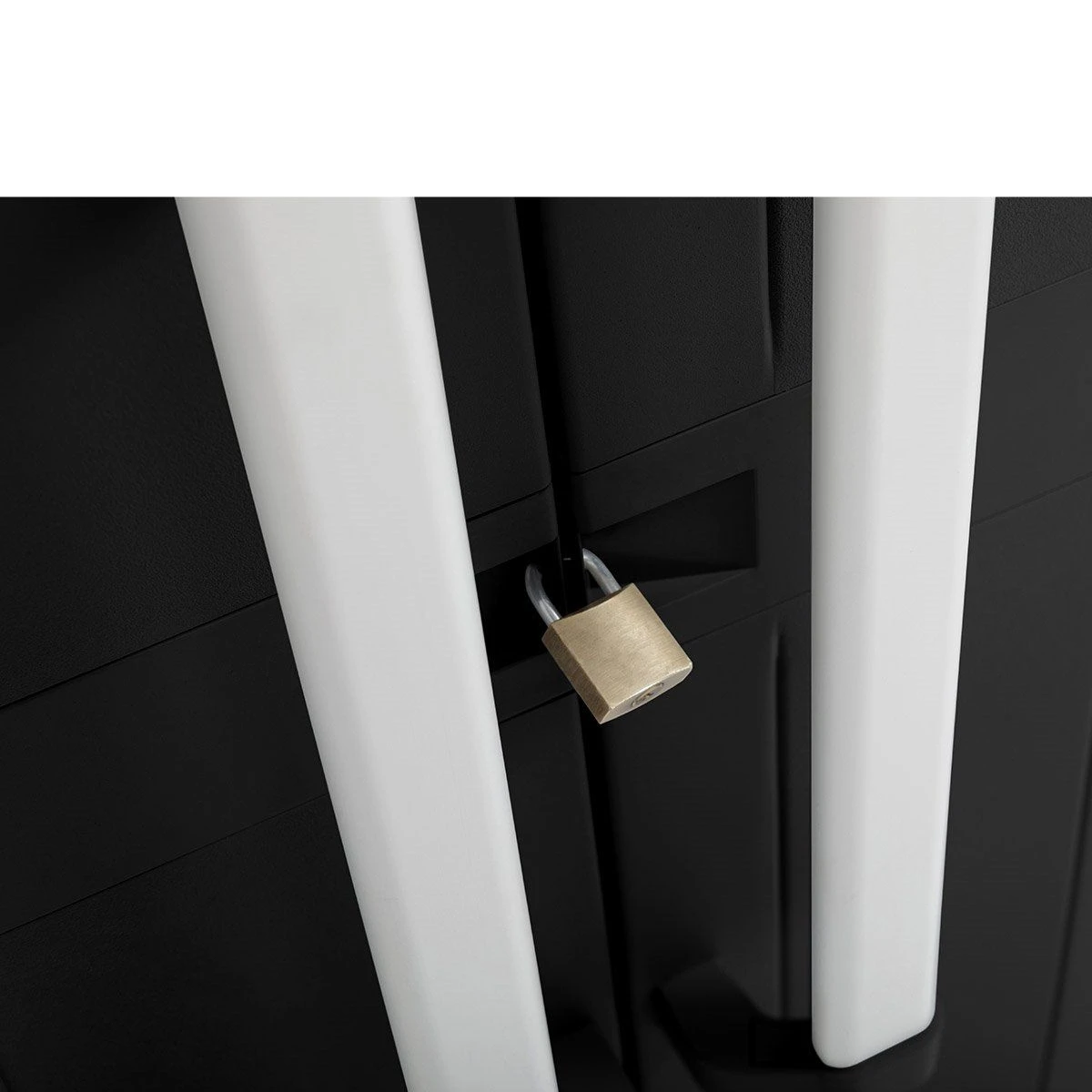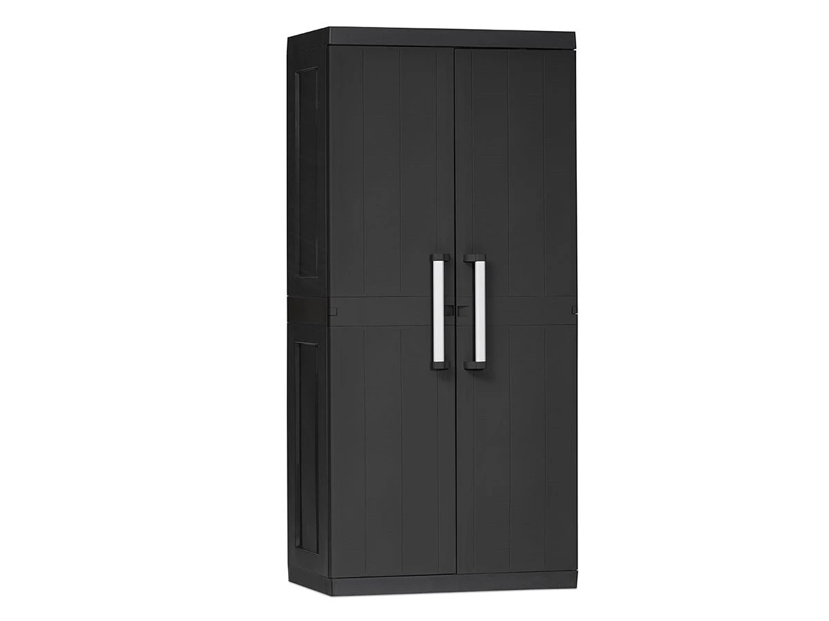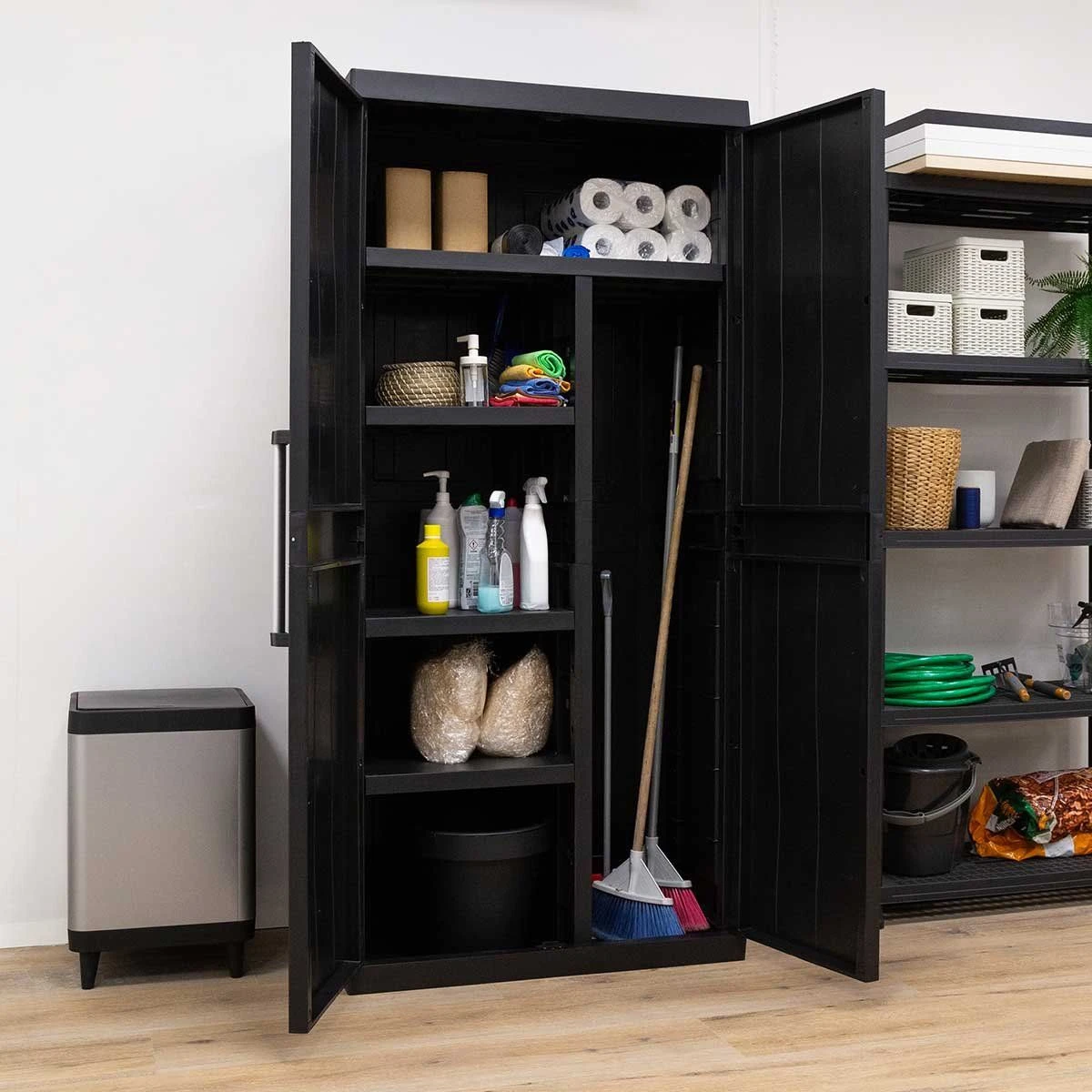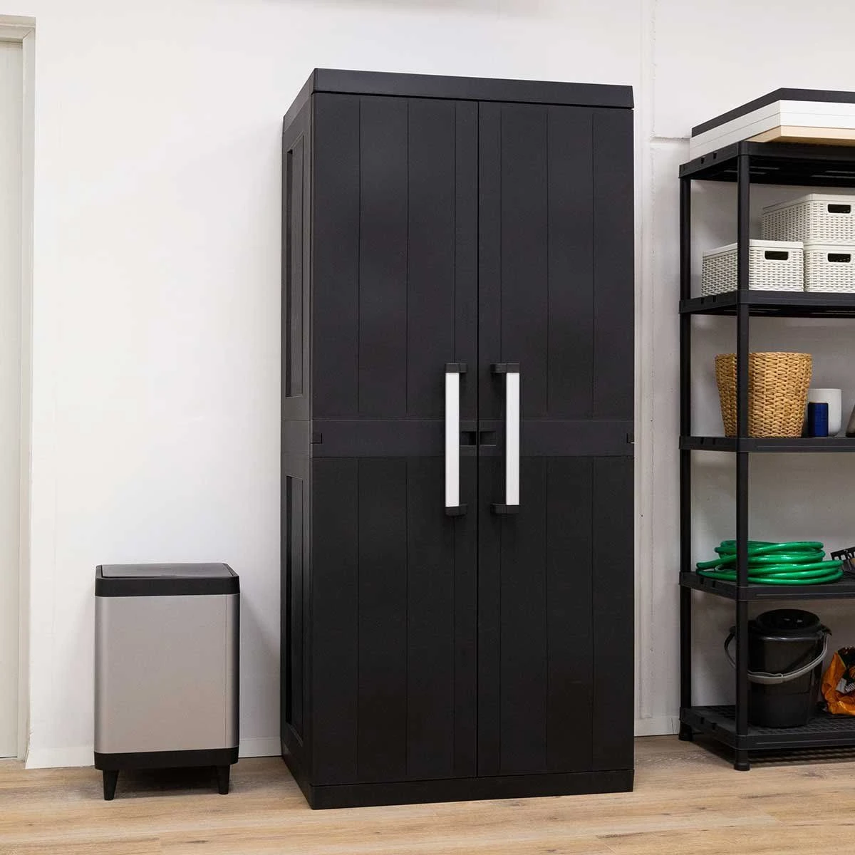 Toomax Garage Mega utility opbergkast hoog – AntracietDe Toomax Garage mega utility opbergkast hoogis de perfecte oplossing voor het opbergen van kussens, tuinaccessoires en andere spullen in je tuin of in je garage. Deze stijlvolle en multifunctionele opbergkast biedt een combinatie van gebruiksgemak, duurzaamheid en een aantrekkelijk ontwerp. De opbergkast beschikt over een hangslotvoorziening zodat je de box volledig kan afsluiten. (hangslot niet meegeleverd). Op de bovenste plank kan je 50kg plaatsen. Op de lagere planken kan je 25kg per plank plaatsen.Makkelijk in gebruikDeToomax Garage Megautilityopbergkast hoogis gemakkelijk in elkaar te zetten door middel van klikverbindingen. Hiervoor is geen gereedschap benodigd.KenmerkenGeschikt voor binnen (en buiten overdekt)Aluminium handelsSpatwaterdichtOpbergplanken zijn verstelbaarGeschikt voor bezems en andere lange voorwerpendraaggewicht per plank: 50 & 25 kgKan worden vastgemaakt aan de muurKan op slot worden gedaan89x54x190 cm (LxBxH)Afmeting binnenmaat 79 (breedte) x 46,5 (diepte) x 188 (hoogte) cm