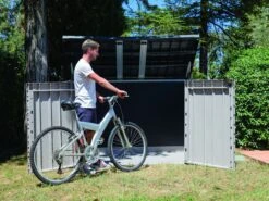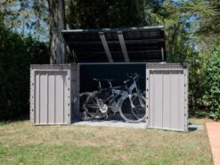 Kenmerken-Volume van 2770L-Afmetingen 216 (breedte) x 109 (diepte) x 140 (hoogte) cm-Klapdeksel en twee deuren-Geschikt voor 2 containers van 360L en één 240L-Geschikt voor binnen en buiten-Weer en vorstbestendig-Makkelijk in elkaar te zetten