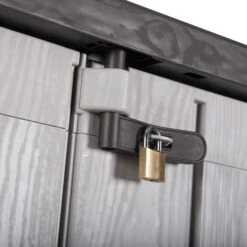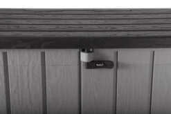 Toomax Stora Way opbergbox – 842L – lichtgrijs/antracietDe Toomax Stora Way opbergbox is de perfecte oplossing voor het opbergen van kussens, tuinaccessoires en prullenbakken in je tuin of op je terras. Deze stijlvolle en functionele opbergbox biedt een combinatie van gebruiksgemak, duurzaamheid en een aantrekkelijk ontwerp. Deze box kan open via de twee deurtjes maar ook door de klapdeksel. Door het grote volume is er genoeg plek voor het opbergen van tuinkussens of verschillende soorten tuingereedschap, maar ook voor twee 120L containers. De opbergbox beschikt over een hangslotvoorziening zodat je de box volledig kan afsluiten. (hangslot niet meegeleverd).