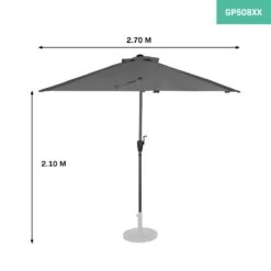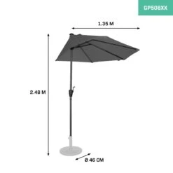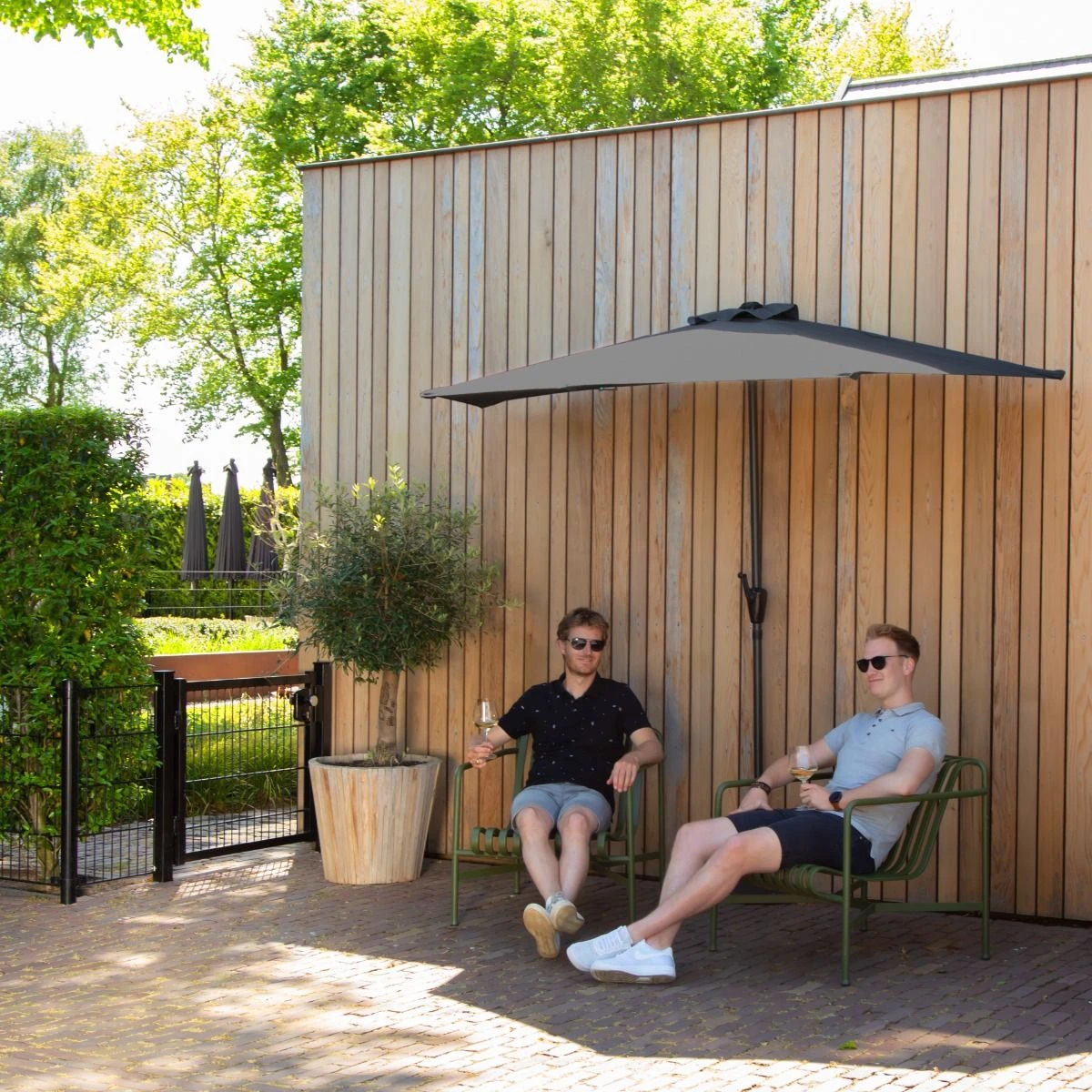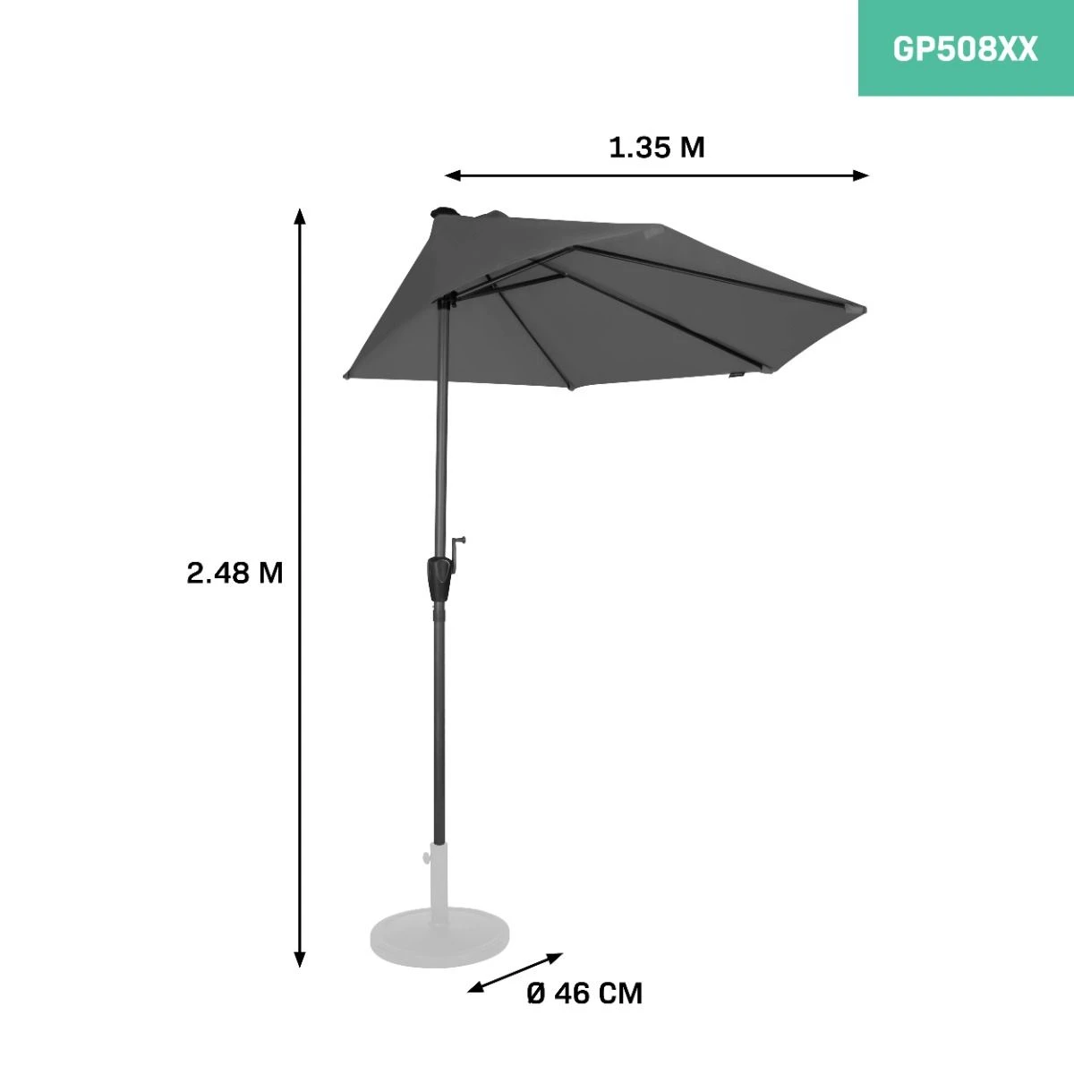 – Dankzij de halfronde constructie kan de parasol direct tegen de muur worden geplaatst. Ideaal voor balkons, patio’s, terrassen of kleine tuinen.