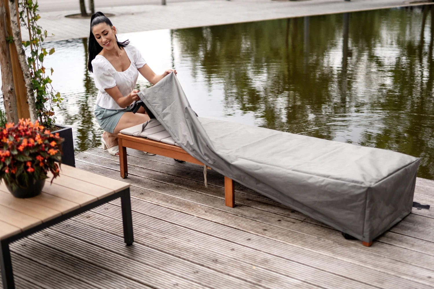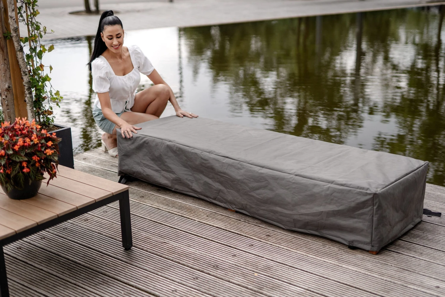 Beschrijving: Beschermhoes voor een ligbed. De hoes is gemaakt van een luxe en duurzaam PP textiel met coating in de kleur grijs, is waterdicht (ook de naden), UV bestendig en kleurvast.