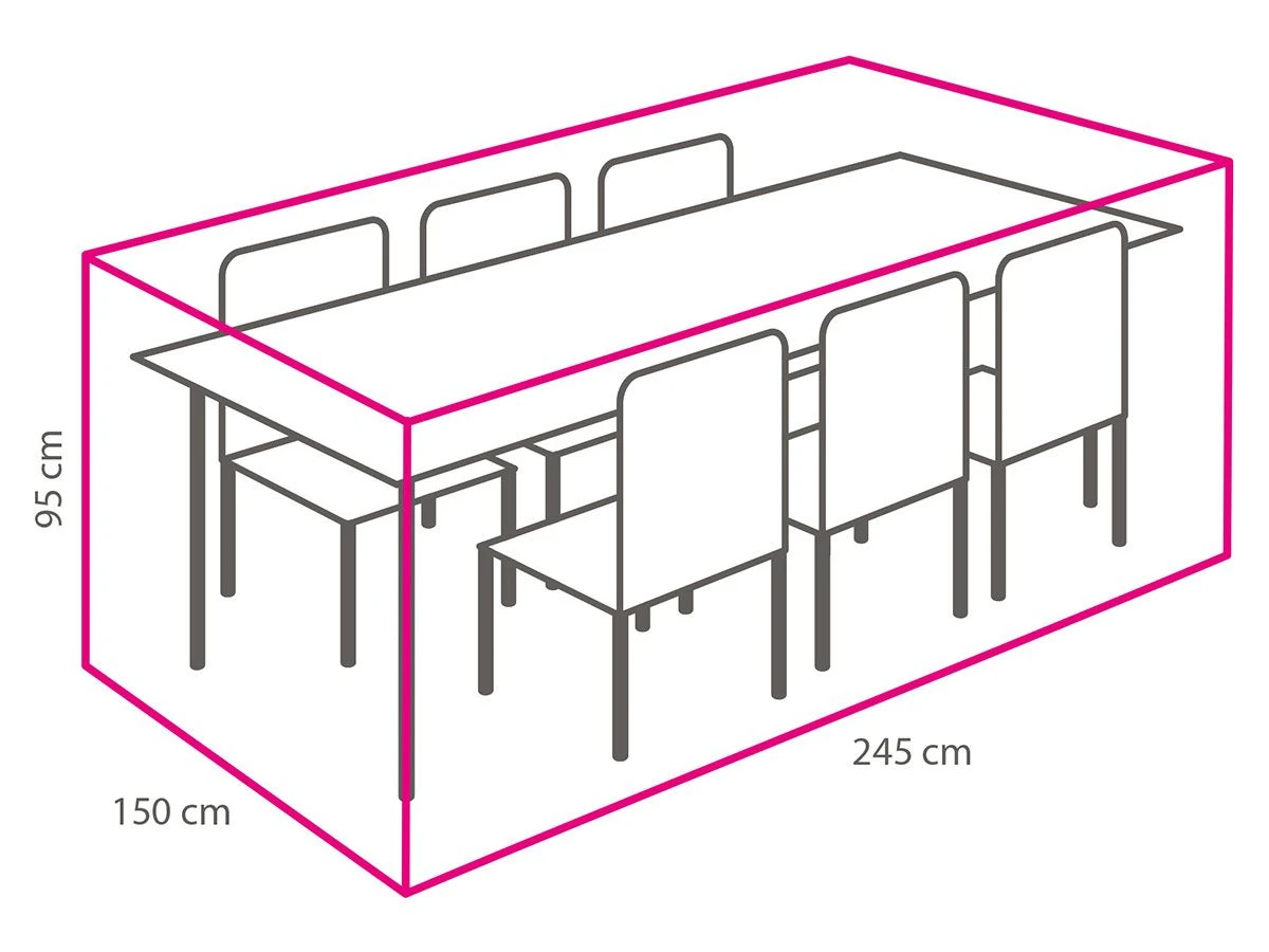 De hoes heeft een afmeting van 245x150x95 cm en is gemaakt van duurzaam HDPE-weefsel met een waterproof coating, hierdoor is deze waterafstotend, maar niet 100% waterdicht bij de naden. Deze hoes beschermt je tuinset tegen UV-straling, spatwater, stof en vuil.
