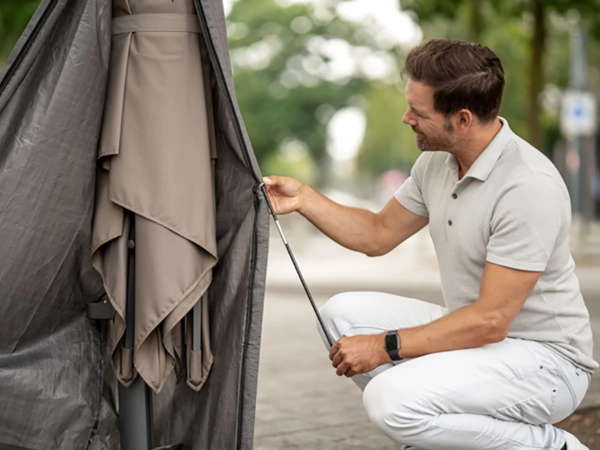 Zorg ervoor dat de parasol altijd helemaal droog is voordat je een hoes gebruikt, voor zowel kort- als langdurig gebruik.