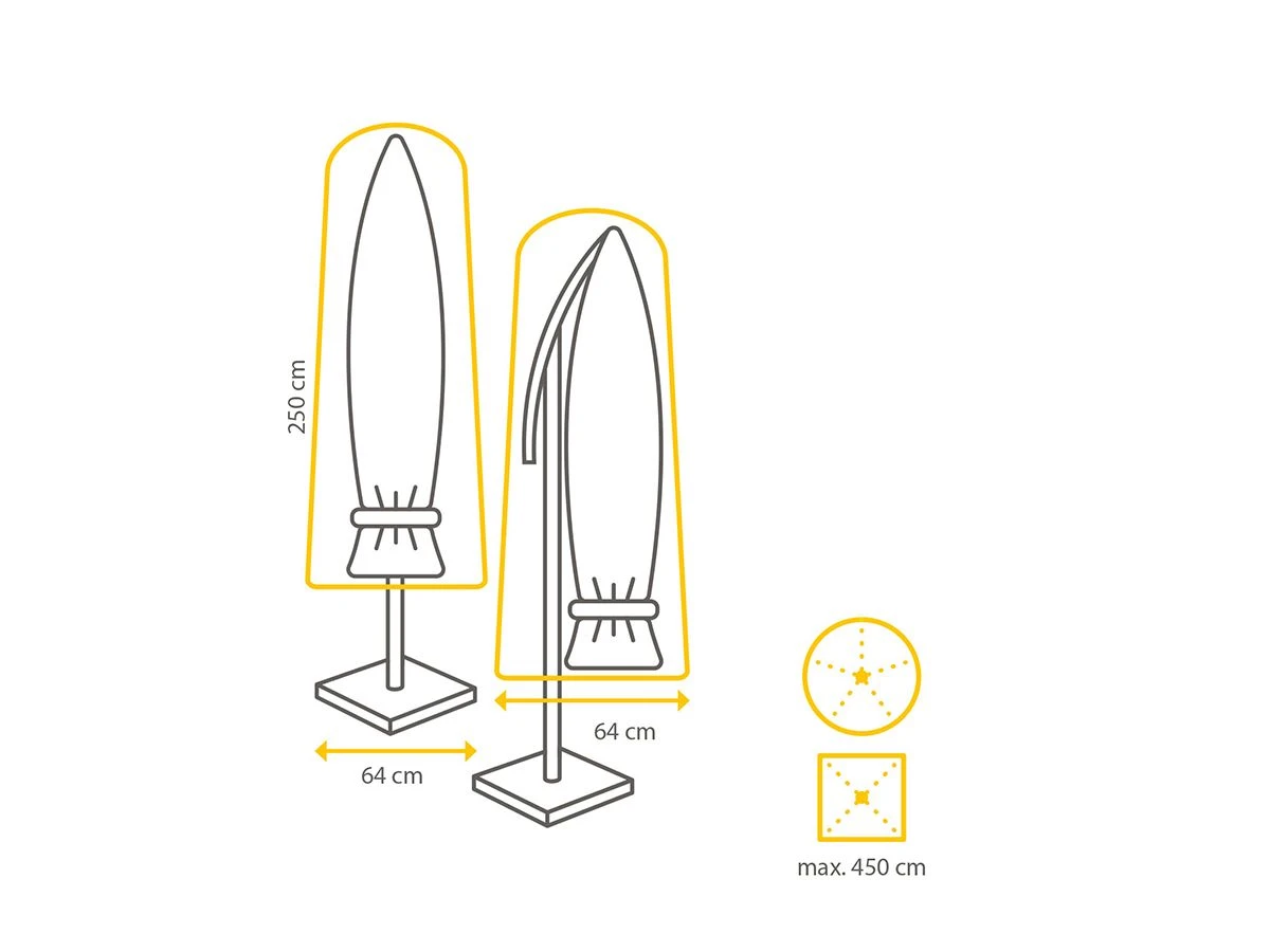 Deze parasolhoes heeft een recht model met een afmeting van 250 x 64 cm en is gemaakt van hoogwaardig polypropyleen met een waterdichte coating, waardoor de hoes waterdicht is en bestand is tegen UV-straling. Hierdoor is deze hoes geschikt voor alle weersomstandigheden. De hoes wordt geleverd inclusief een handige opvouwbare stok en is voorzien van een rits, zodat het erg gemakkelijk is om de hoes over de parasol te hangen.