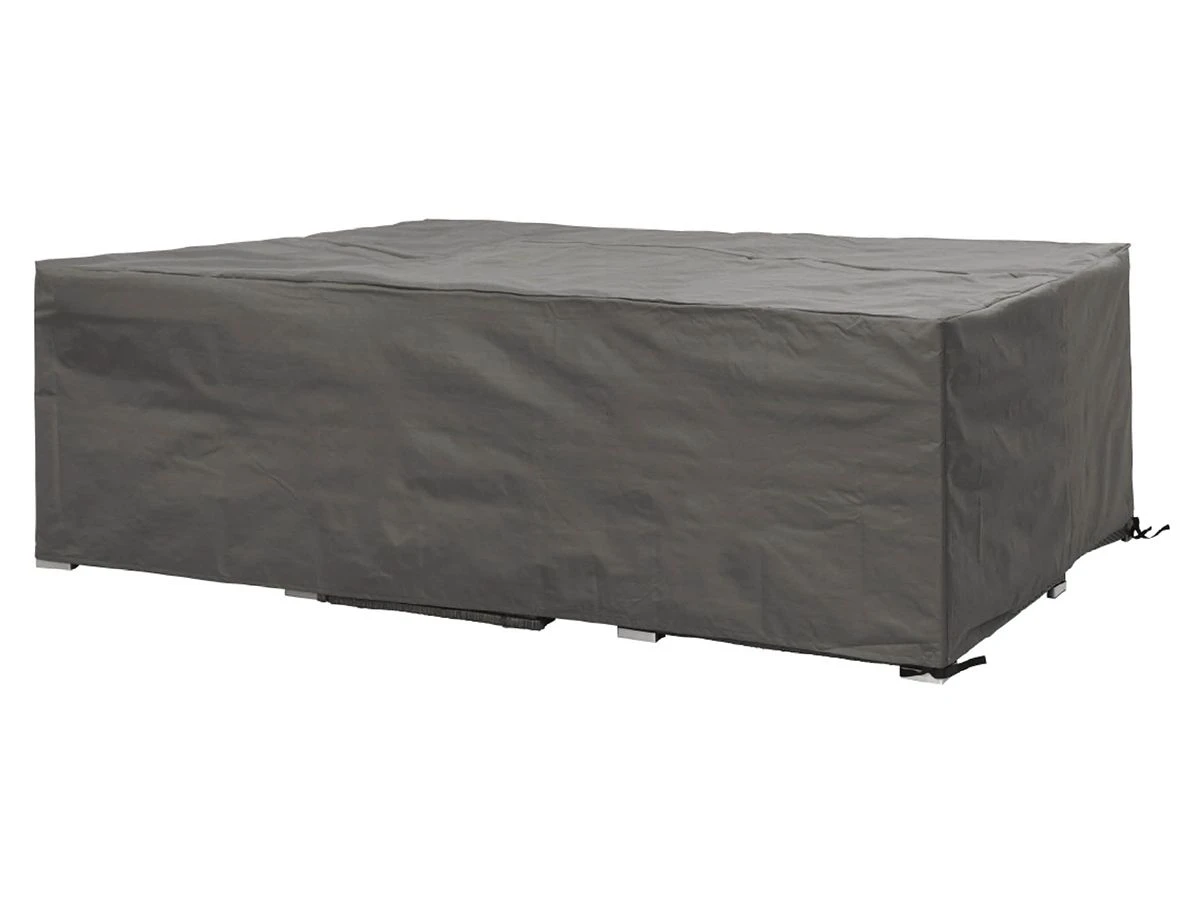 Beschrijving: Beschermhoes voor een lounge set, bv een lounge bank, een tafel en 2 stoelen. De hoes is gemaakt van een luxe en duurzaam PP textiel met coating, in de kleur grijs, is waterdicht (ook de naden), UV bestendig en kleurvast.