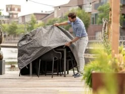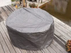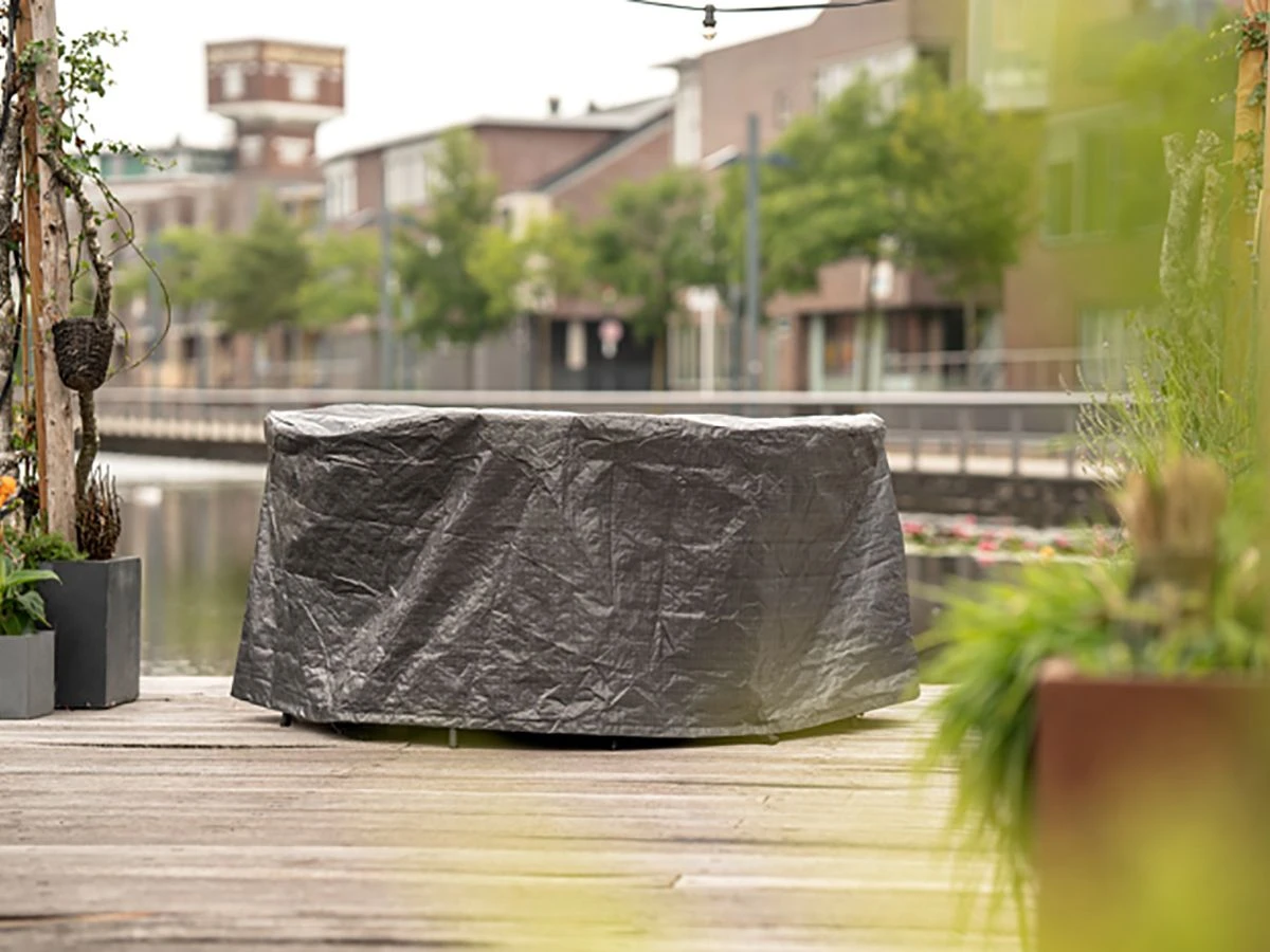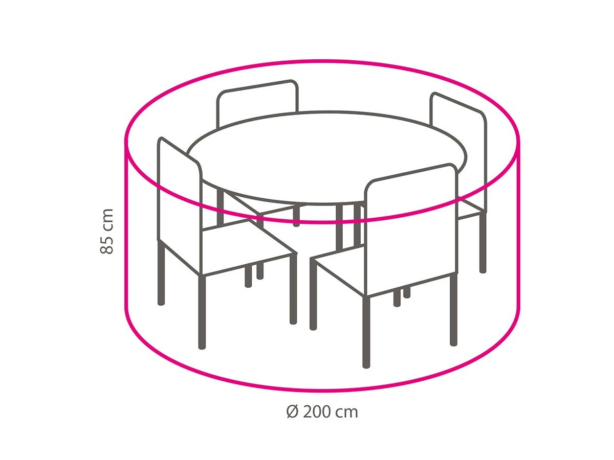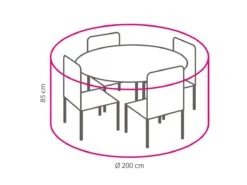 De hoes heeft een afmeting van Ø 200×85 cm en is gemaakt van duurzaam HDPE-weefsel met een waterproof coating, hierdoor is deze waterafstotend, maar niet 100% waterdicht bij de naden. Deze hoes beschermt je tuinset tegen UV-straling, spatwater, stof en vuil.